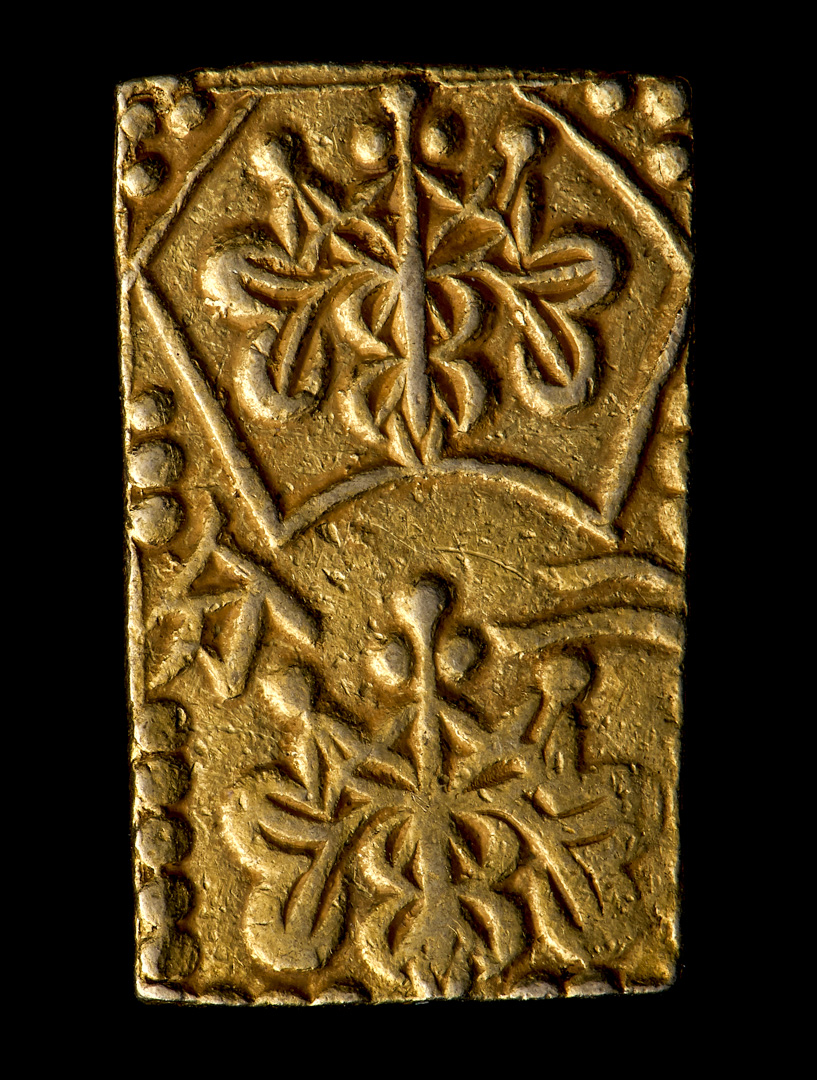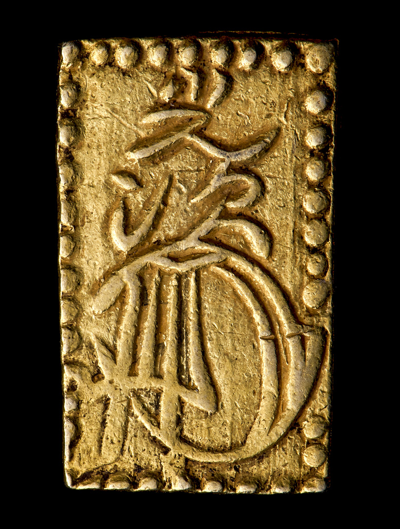 Minted from the early 17th century until just after the fall of the Tokugawa shogunate in 1869. Feudal Japanese gold coins are remnants of a time when Japan was still largely agrarian, feudal and isolated. At this point in its history, Japan was ruled by traditional samurai lords who had cultivated their warrior philosophy for more than a millennium. The Japanese word for silver is "gin" and their word for gold is "kin". Therefore, a one bu silver coin would be called an ichibu gin, which translates as "one-bu silver". Likewise, a similar one bu coin in gold would be called an ichibu kin, or "one-bu gold". Most Tokugawa period Japanese gold coins available in the market today are smaller one (ichi) or two (ni) shu or bu denominations. These coins are called isshu-kin (one-shu gold), nishu-kin (two-shu gold), ichibu-kin (one-bu gold) and nibu-kin (two-bu gold), respectively. These smaller shu and bu Japanese gold coins from the Tokugawa shogunate have an unusual rectangular shape surrounded by finely beaded borders that is reminiscent of a miniature bar or ingot. Covered in exotic Japanese calligraphy and stylized paulownia flowers, shu and bu gold coins unequivocally exude the style of traditional samurai Japan.