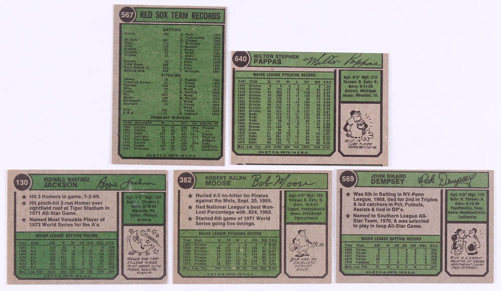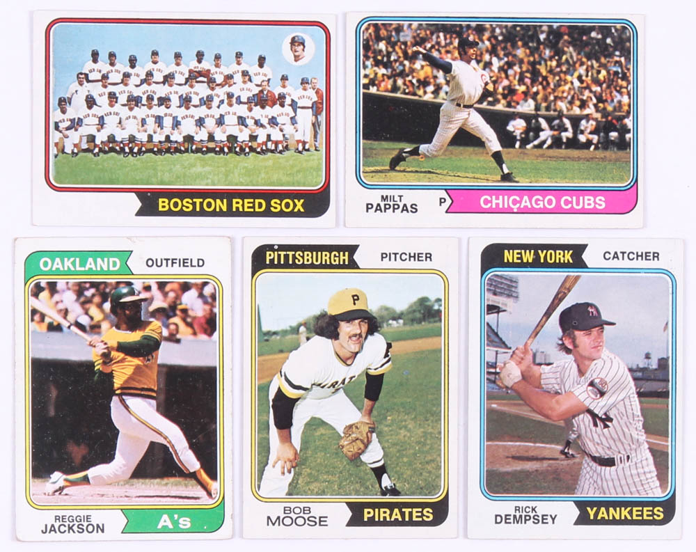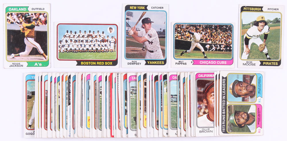 Lot of (70) 1974 Topps Baseball Cards with #569 Rick Dempsey, #382 Bob Moose, #130 Reggie Jackson, #567 Boston Red Sox Team Card, #640 Milt Pappas
