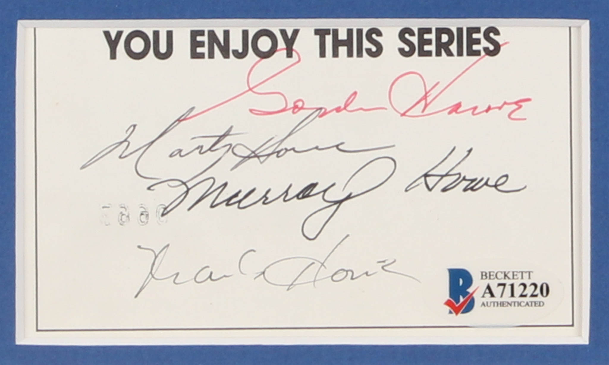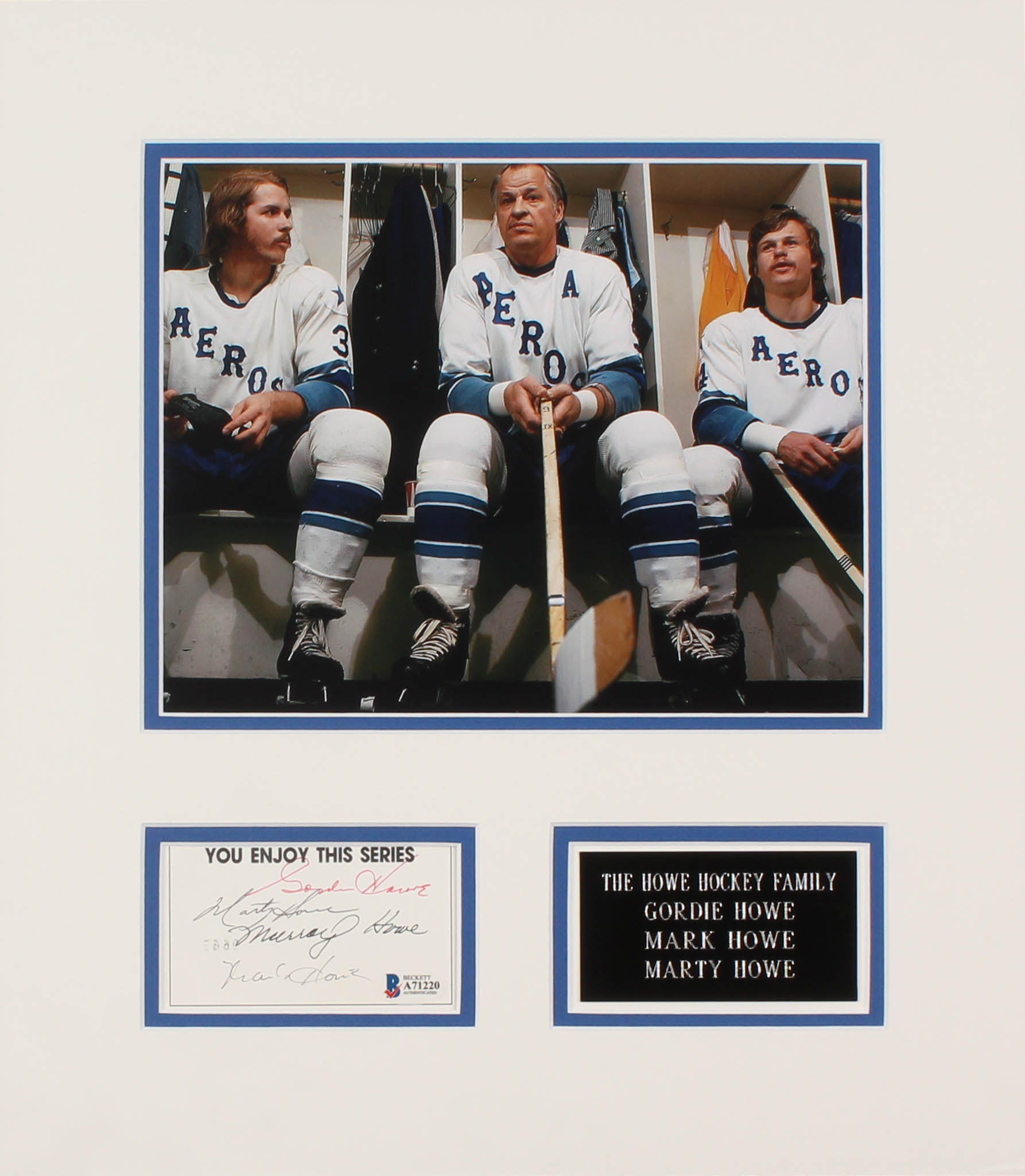 Custom framed index card cut display measures approximately 14" x 16" in size and features an 8" x 10" photo. Index card cut has been hand-signed in blue and red ink pen by Gordie Howe, Marty Howe, Murray Howe, & Mark Howe.