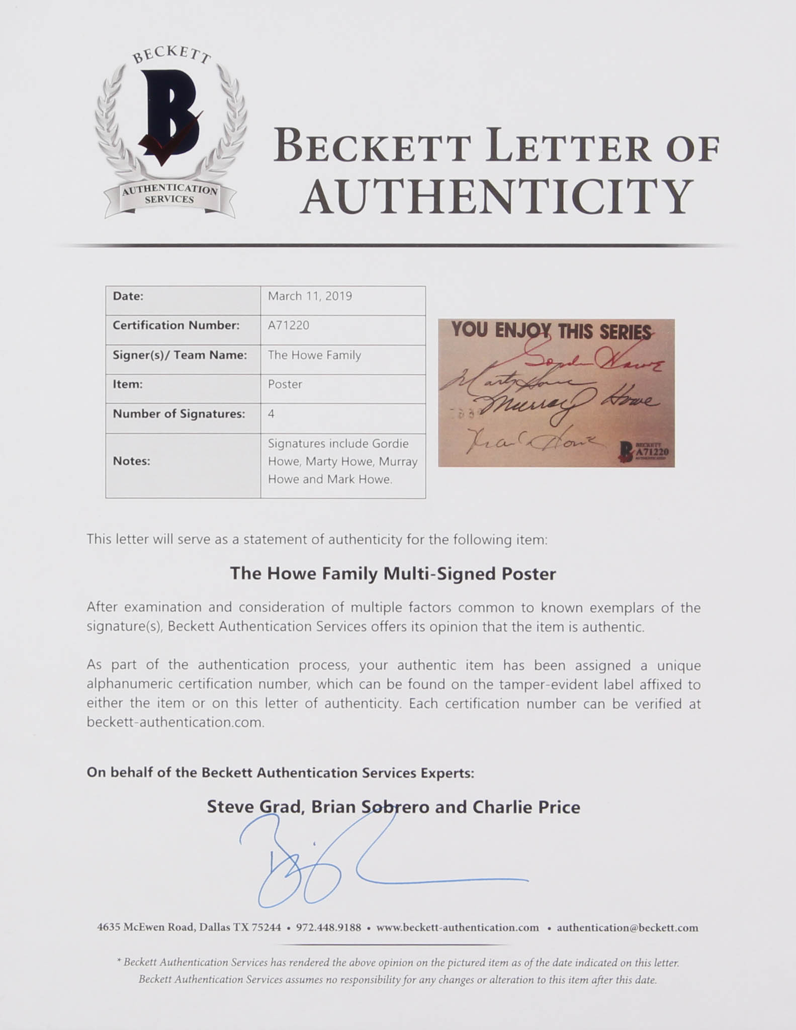 The lot / autograph(s) includes an official Beckett Authentication Services hologram and matching LOA for authenticity purposes.