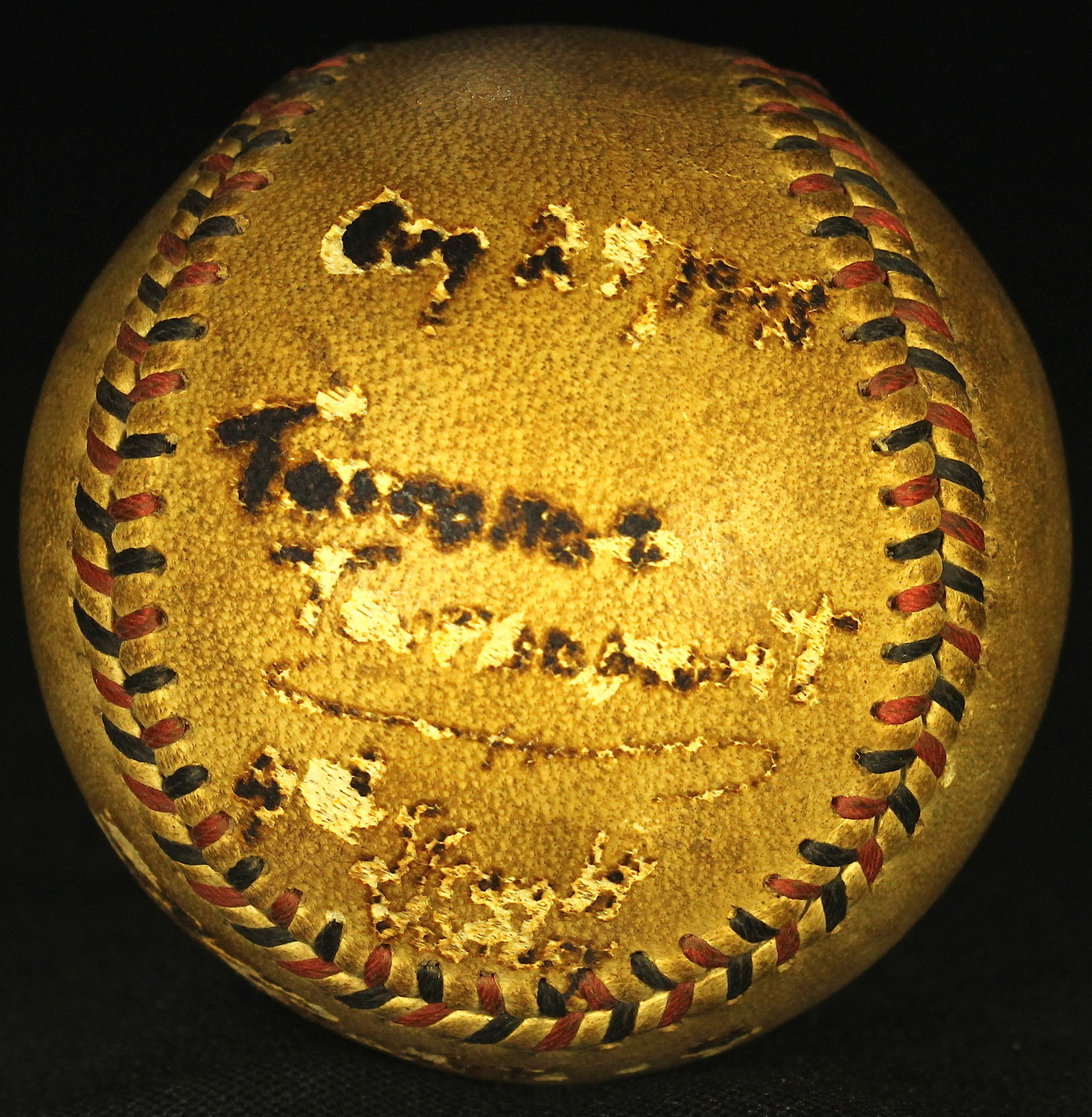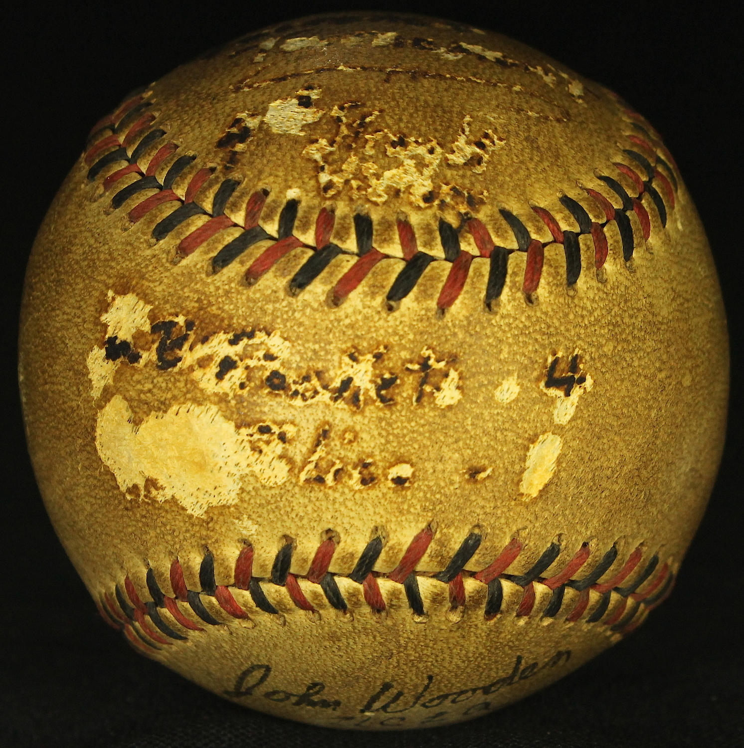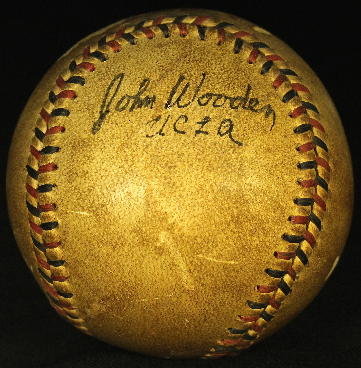 Vintage baseball hand-signed by legendary coach John Wooden (D 2010). The ball has some other unidentified writing on it including what appears to be a date. Possibly a game-used or trophy presentation baseball. The piece includes a James Spence Authentication (JSA) Auction House LOA for authenticity purposes.