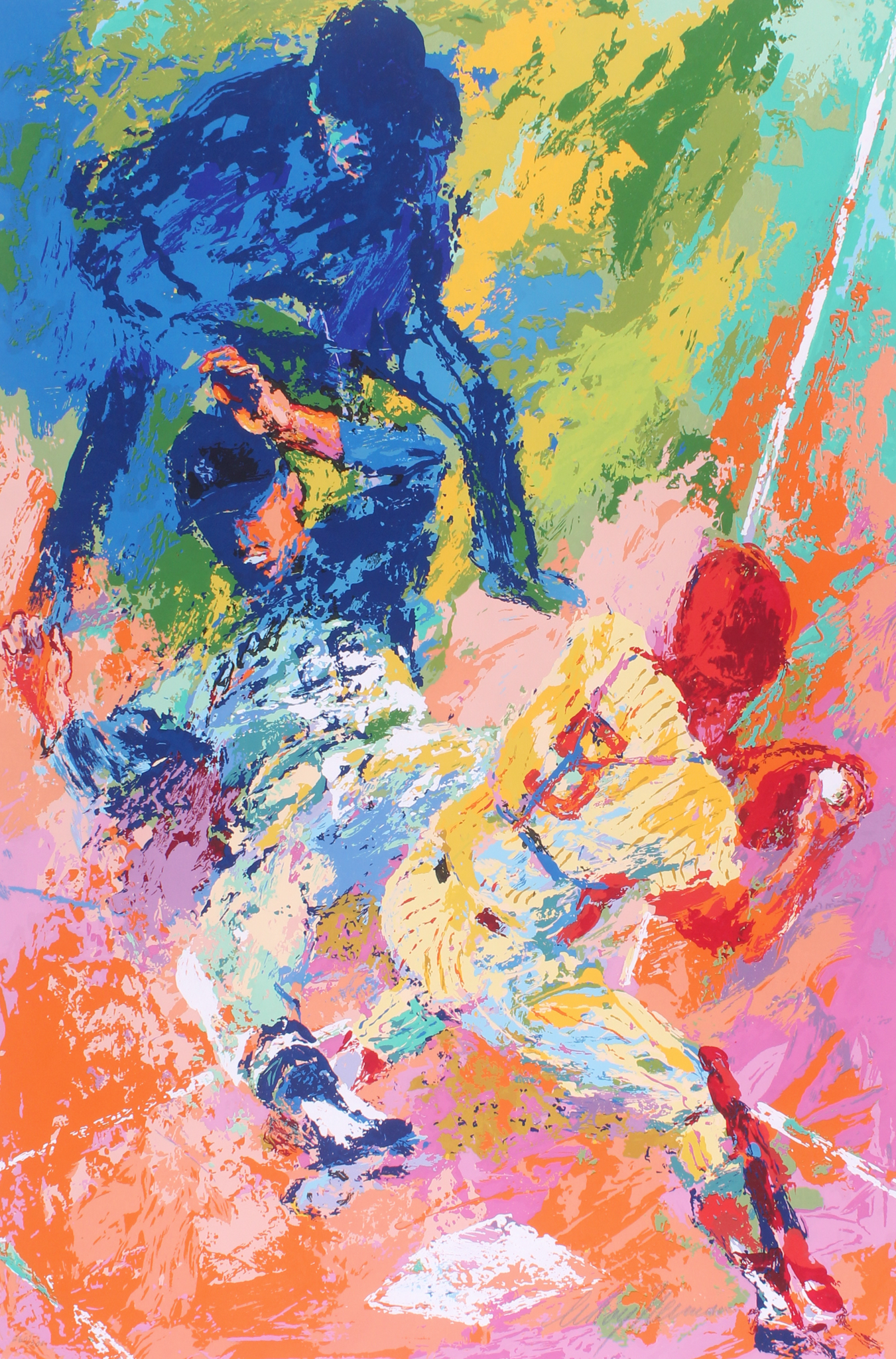Serigraph measures 24" x 36" in size and features "Sliding Home" signed in charcoal by Leroy Neiman (D.2012).