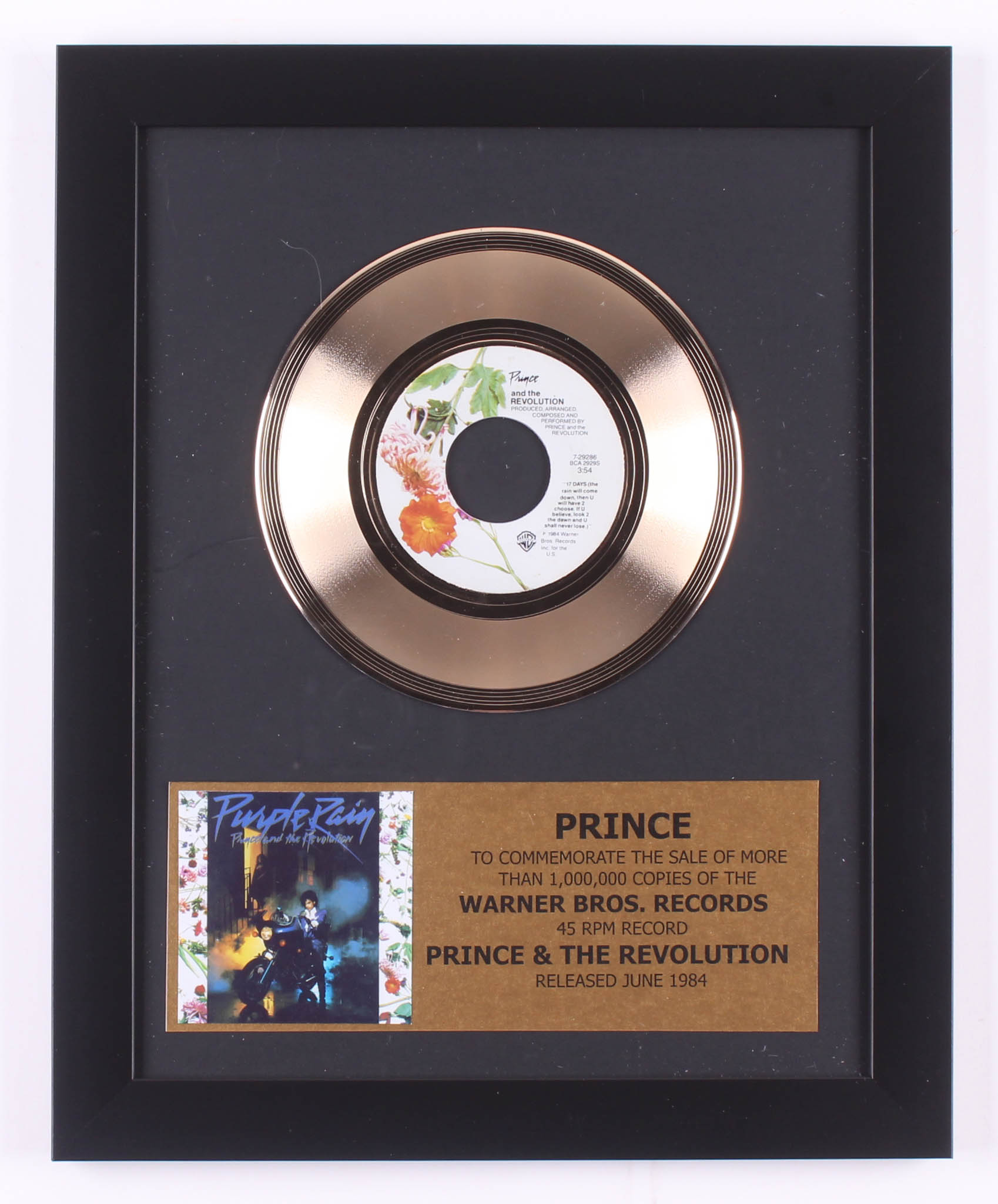 Custom framed award measures approximately 13" x 16" in size. The plaque identifies it as an award presented "to commemorate the sale of more that 1,000,000 copies of the Warner Bros. Records Album 'Prince & The Revolution' released June 1984. Please note, the record is unsigned.