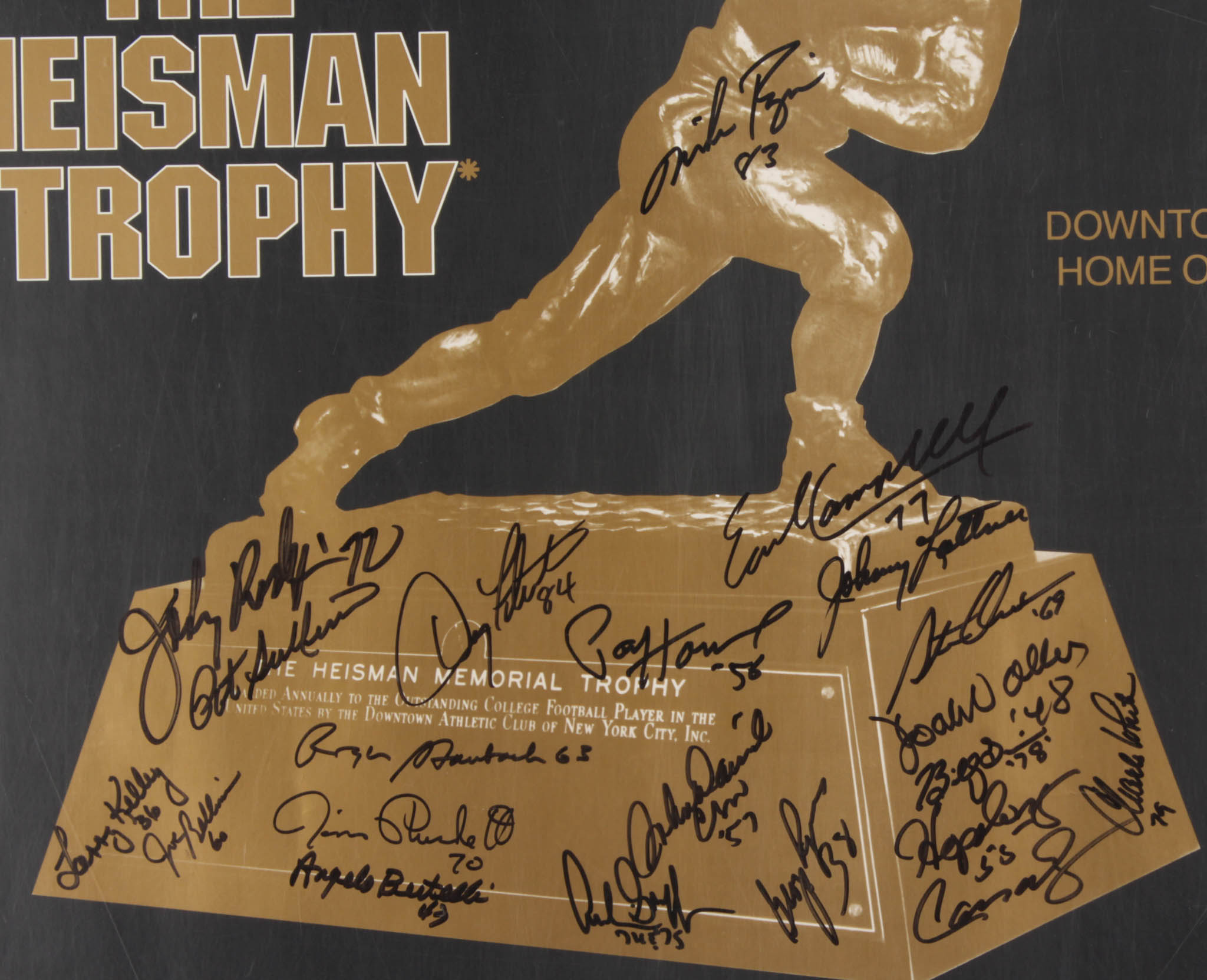 Poster measures 22" x 28" and has been hand-signed in black felt-tip pen by (20) including Roger Staubach (Dallas Cowboys, HOF), Paul Hornung (Green Bay Packers, HOF), Doak Walker (D. 1998, Detroit Lions, HOF), Earl Campbell (Houston Oilers, HOF), Leroy Kelly (Cleveland Browns, HOF), Jim Plunkett (Oakland Raiders), Doug Flutie (San Diego Chargers), Joe Bellino (D. 2019, Boston Patriots), Angelo Bartelli (D. 1999, Chicago Rockets), Mike Rozier (Houston Oilers), Johnny Lattner (Pittsburgh Steelers), Steve Owens (Detroit Lions), Billy Sims (Detroit Lions), Howard Cassady (Detroit Lions), Charles White (Los Angeles Rams), Johnny Rodgers (San Diego Chargers), Pat Sullivan (Washington Redskins), John David Crow (D. 2015, San Francisco 49ers), Archie Griffin (Cincinnati Bengals), and Billy Cannon (D. 2018, Oakland Raiders). Please see photos for details regarding the condition of the poster.