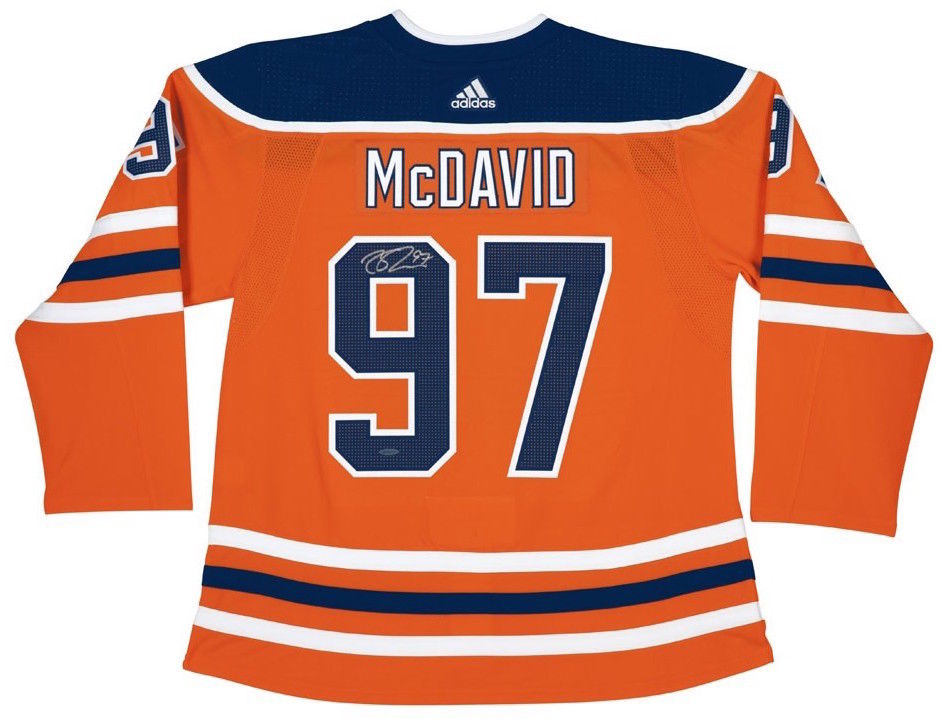 Adidas on-ice style jersey with everything printed on. Hand-signed in silver paint pen by Connor McDavid.