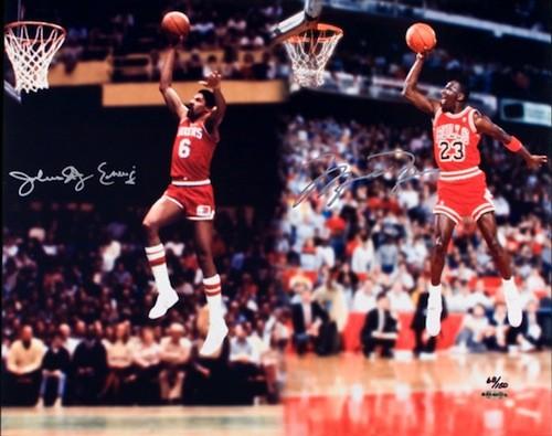 Photo measures 16" x 20" in size and has been hand-signed in silver paint pen by Michael Jordan (Chicago Bulls, HOF) and Julius "Dr. J" Erving (Philadelphia 76ers, HOF). The photo is limited edition and has been hand-numbered #/150.