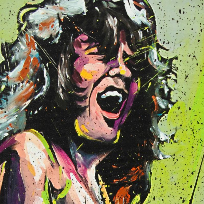 Born in Los Angeles in 1982, David Garibaldi began creating at a young age, though not always with the best intentions. When he was young, Garibaldi participated in a life of vandalism through graffiti; however, near the end of his high school career, Garibaldi decided to turn hip hop culture into a positive influence. In 2003, Garibaldi began putting his creations on paper and canvas, and he would paint live at jazz sessions and nightclubs. Though his work was always directly influenced by music, when he saw the paintings of Denny Dent, the “Rock and Roll Painter,” he was inspired to create a live stage show called “Rhythm and Hue” in which he would paint six foot portraits of pop icons to music. In a matter of minutes, the seemingly random shapes and colors come together to form images of his subjects. In conjunction with the work he creates in his studio, “Rhythm and Hue” has brought Garibaldi success and renown.