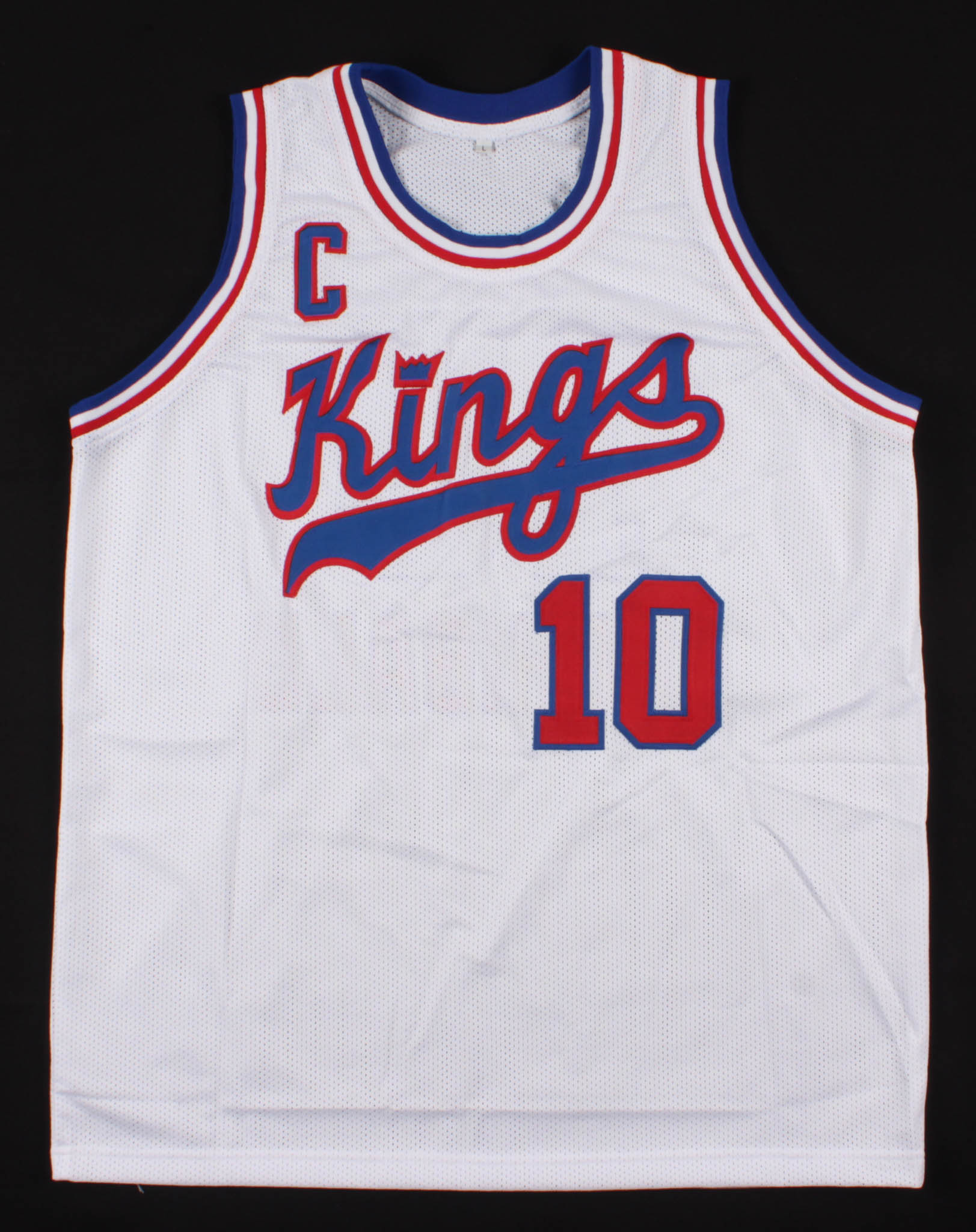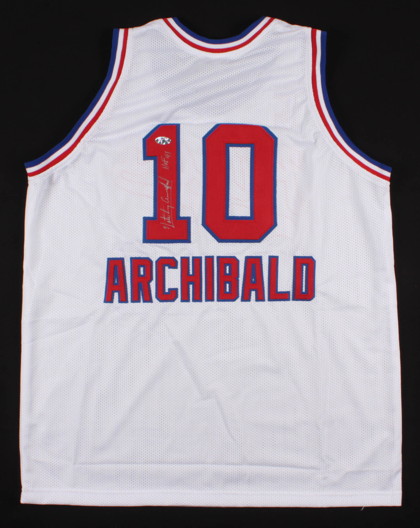 Custom on-court style jersey. Everything is sewn on, size XL. Hand-signed and inscribed in silver paint pen by Nate Archibald (HOF).