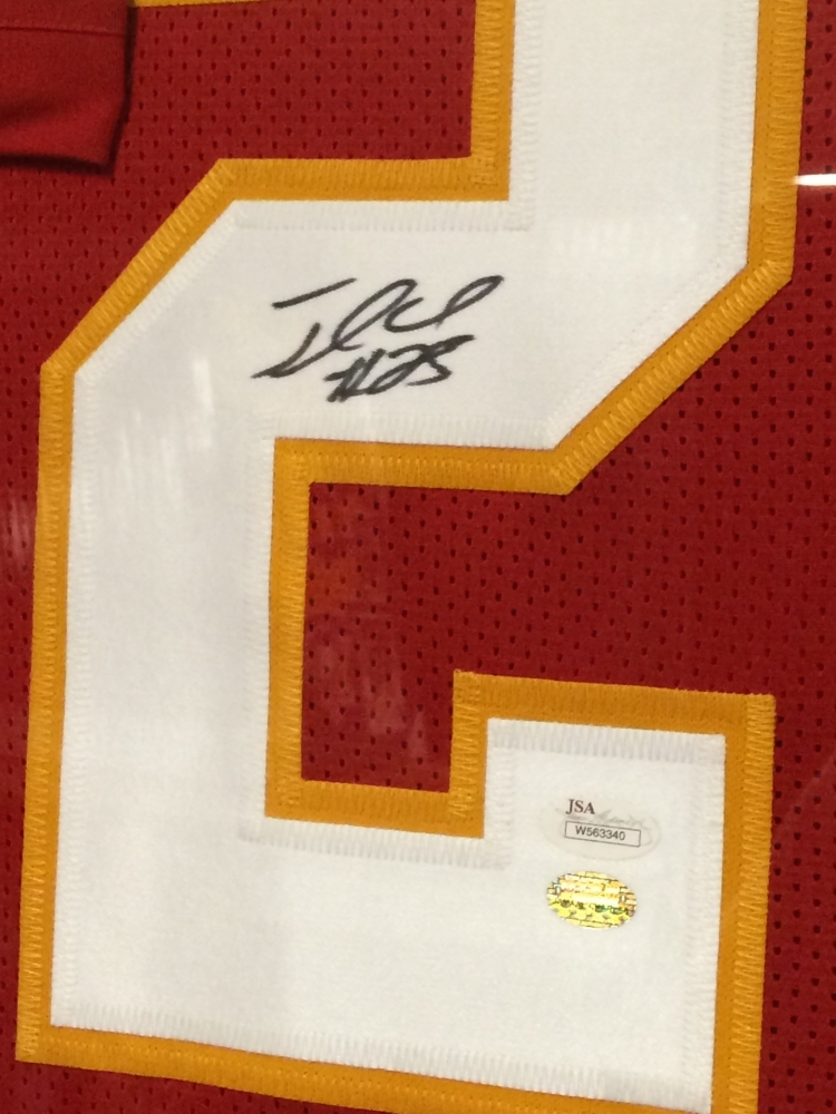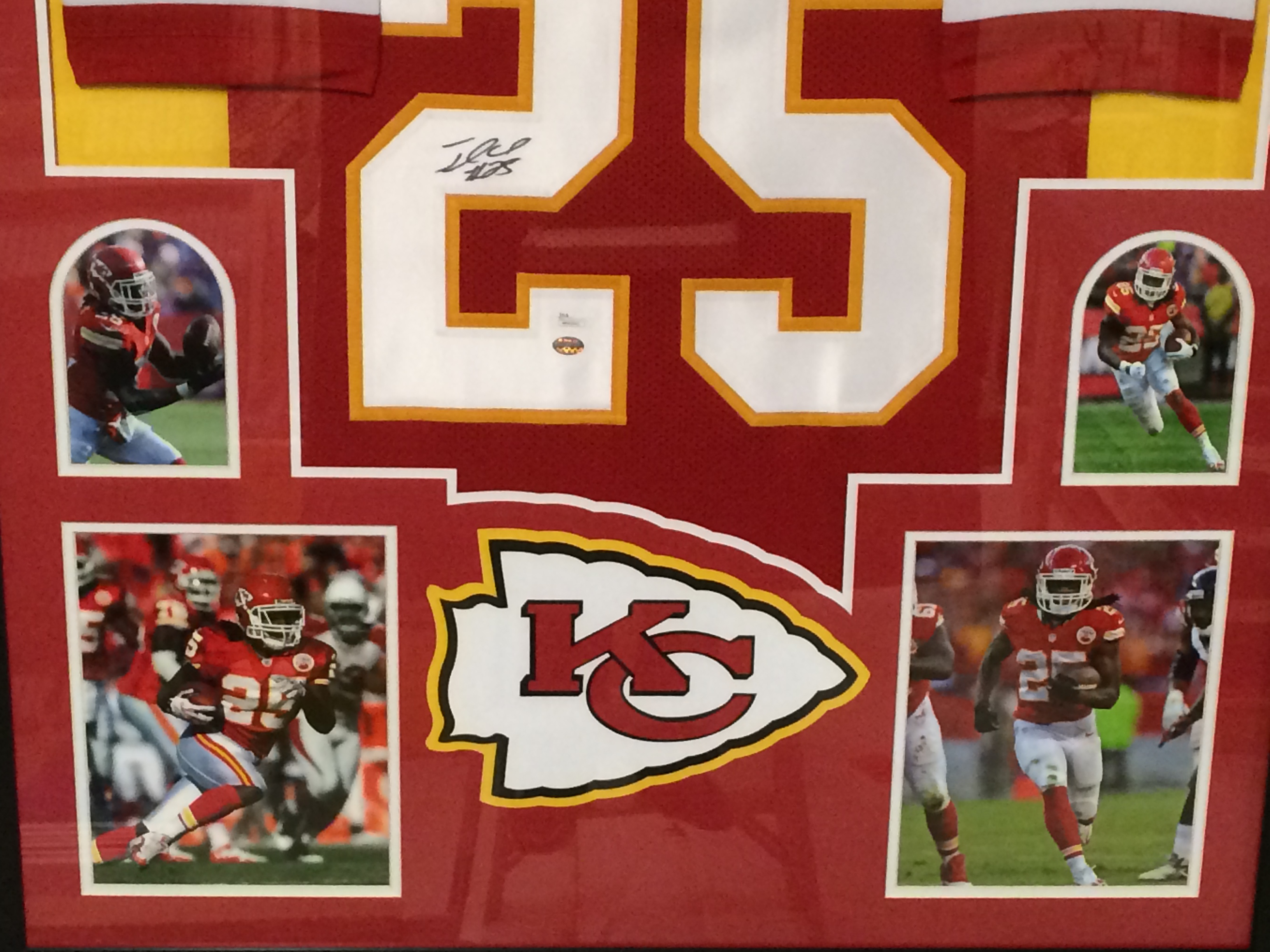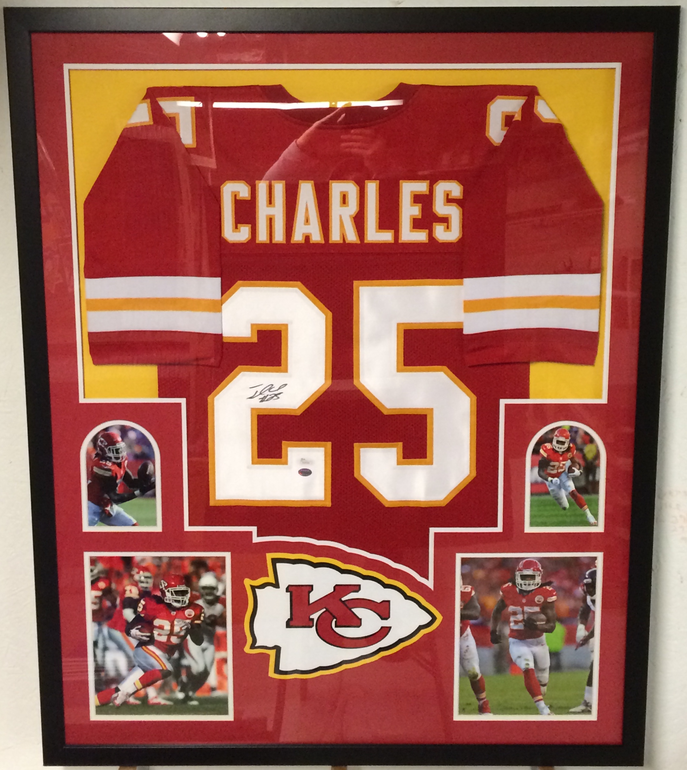 Custom frame measures approximately 35" x 43" in size and features a jersey hand-signed in black felt tip pen by Jamaal Charles.
