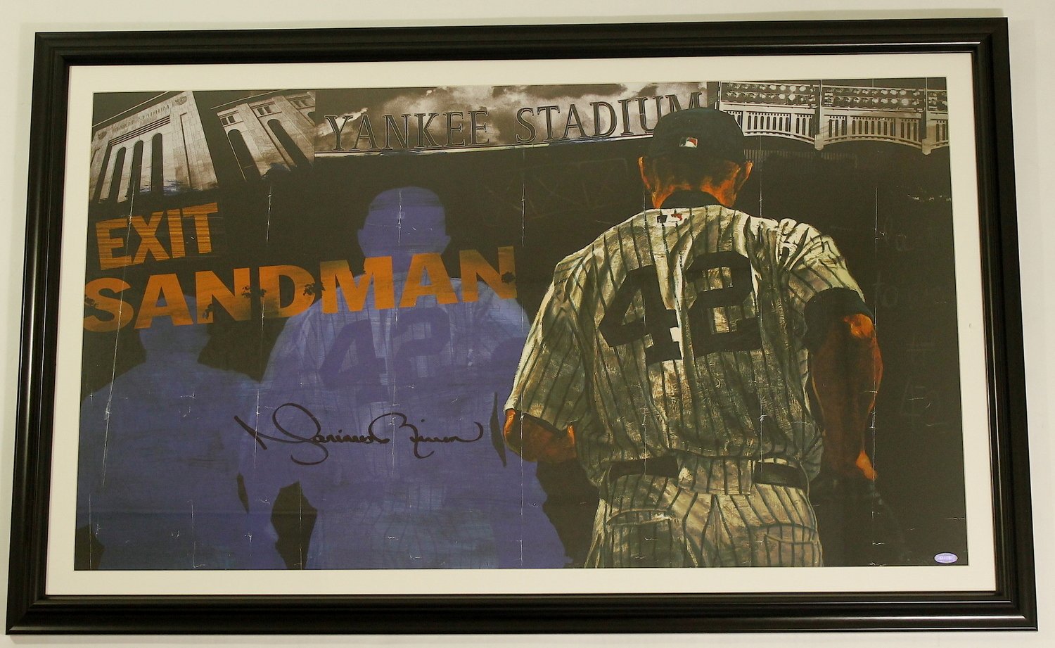 25" x 40" custom framed photo has been hand signed in black felt-tip pen by Mariano Rivera (Yankees). The autograph includes an official Steiner hologram and matching COA for authenticity purposes.