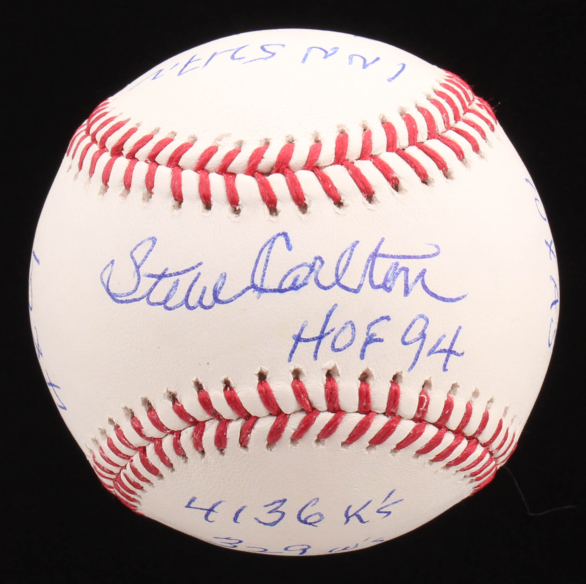 Rawlings Official Major League Baseball. Hand-signed and inscribed in blue ink pen by Steve Carlton (Philadelphia Phillies, HOF).