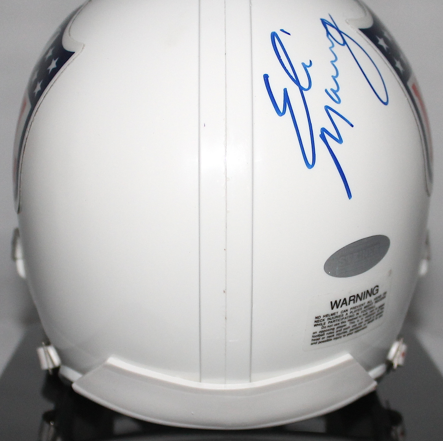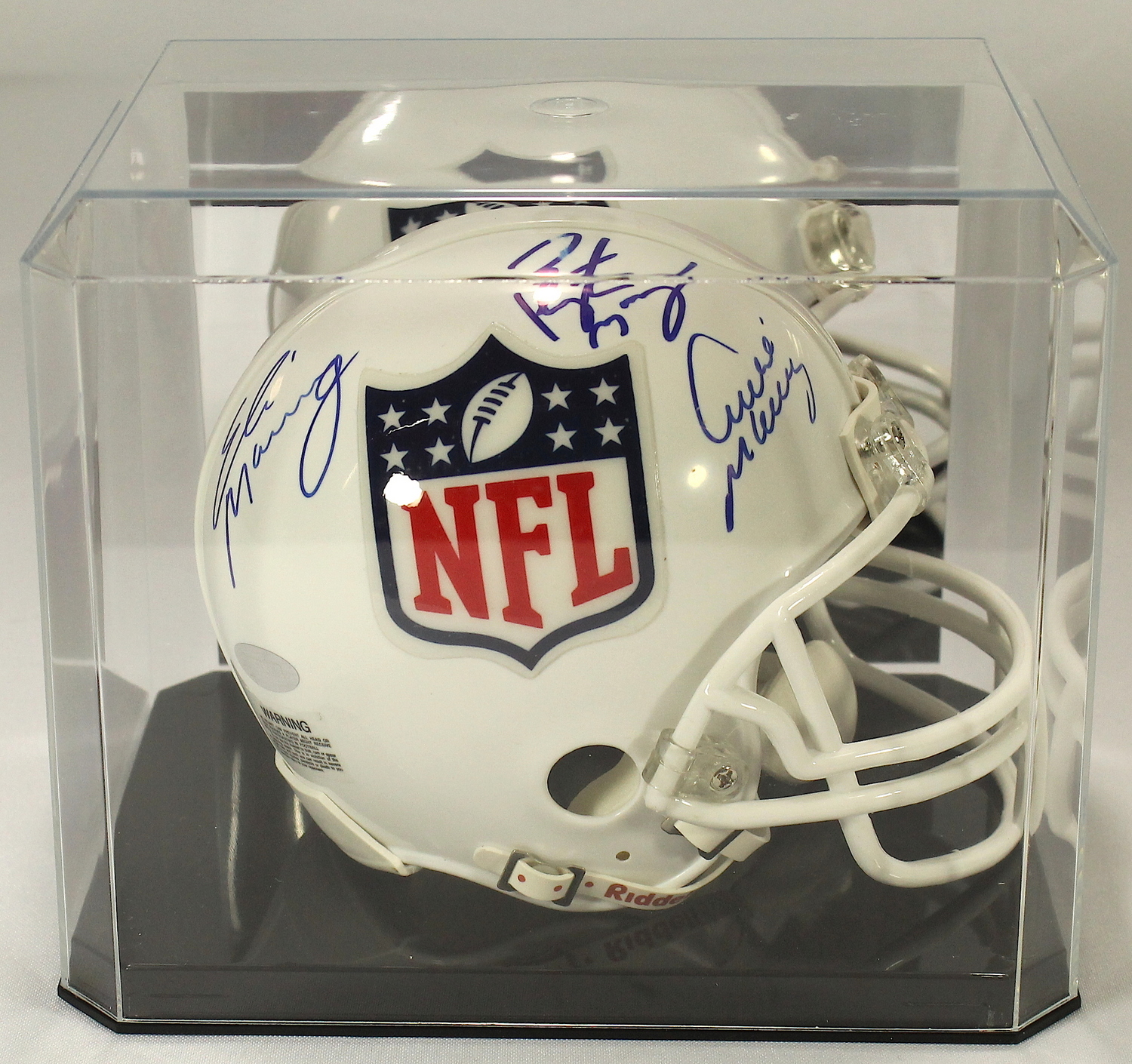 Riddell mini helmet. Hand-signed and in blue felt-tip pen by Archie Manning (Saints), Eli Manning (Giants) & Peyton Manning (Colts HOF). The helmet comes with the display case shown. The autograph includes an official Steiner hologram and matching COA for authenticity purposes.