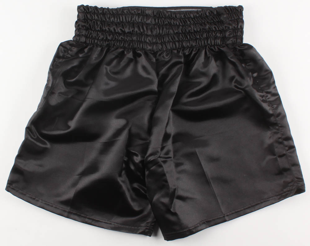 Custom boxing shorts have been hand-signed in silver paint pen by Floyd Mayweather Jr.