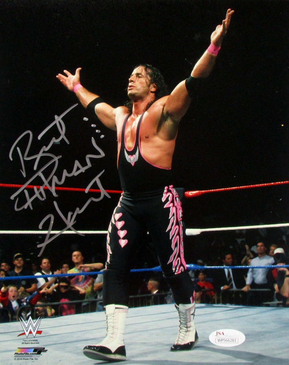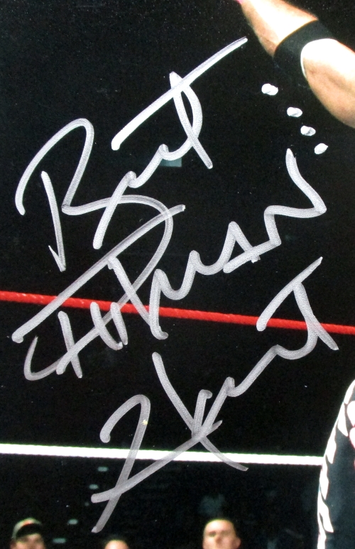 Photo measures 8" x 10" in size and has been hand-signed in silver paint pen by Bret "Hitman" Hart (HOF).