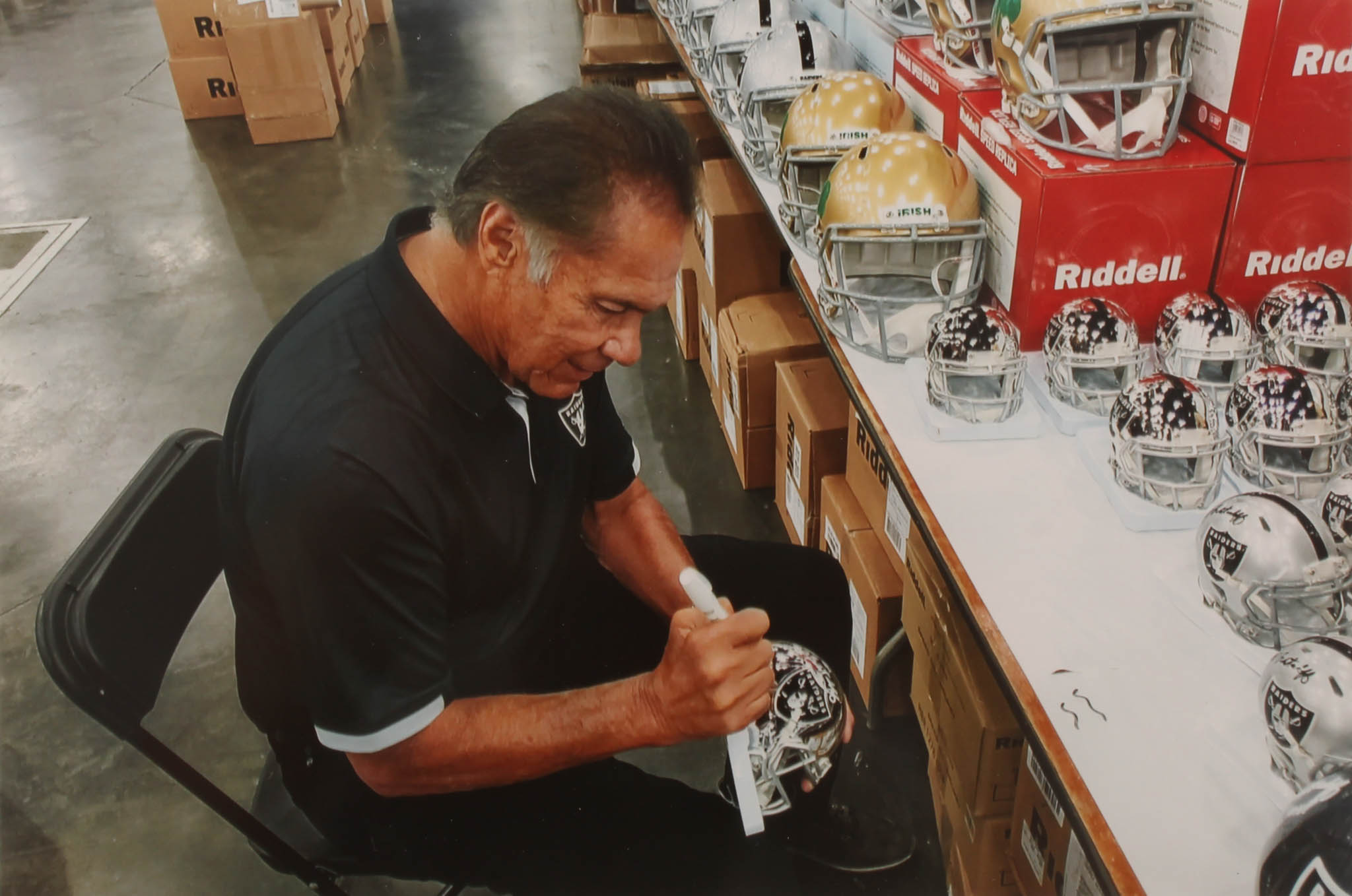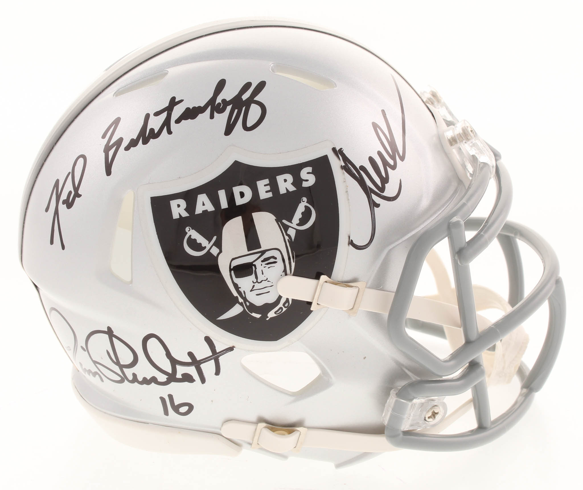 Riddell Oakland Raiders speed mini helmet. Hand-signed in black felt tip pen by Marcus Allen (HOF), Fred Biletnikoff (HOF) and Jim Plunkett.