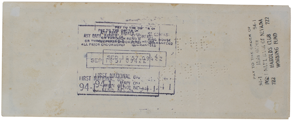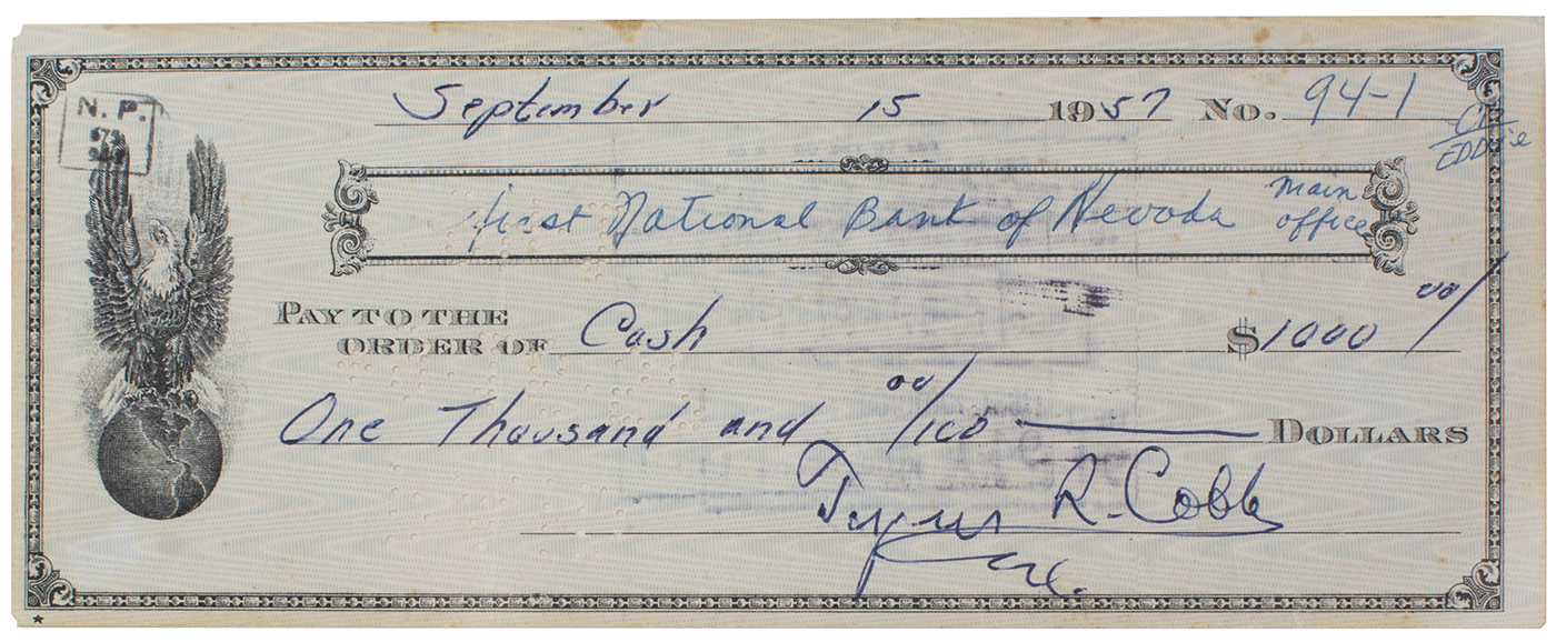 1957 Personal Bank check has been hand-signed in blue ink pen by Ty Cobb (D. 1961, Detroit Tigers, HOF).