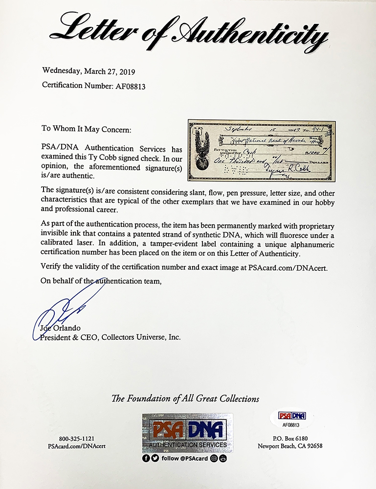 1957 Ty Cobb Signed Personal Check (PSA LOA)