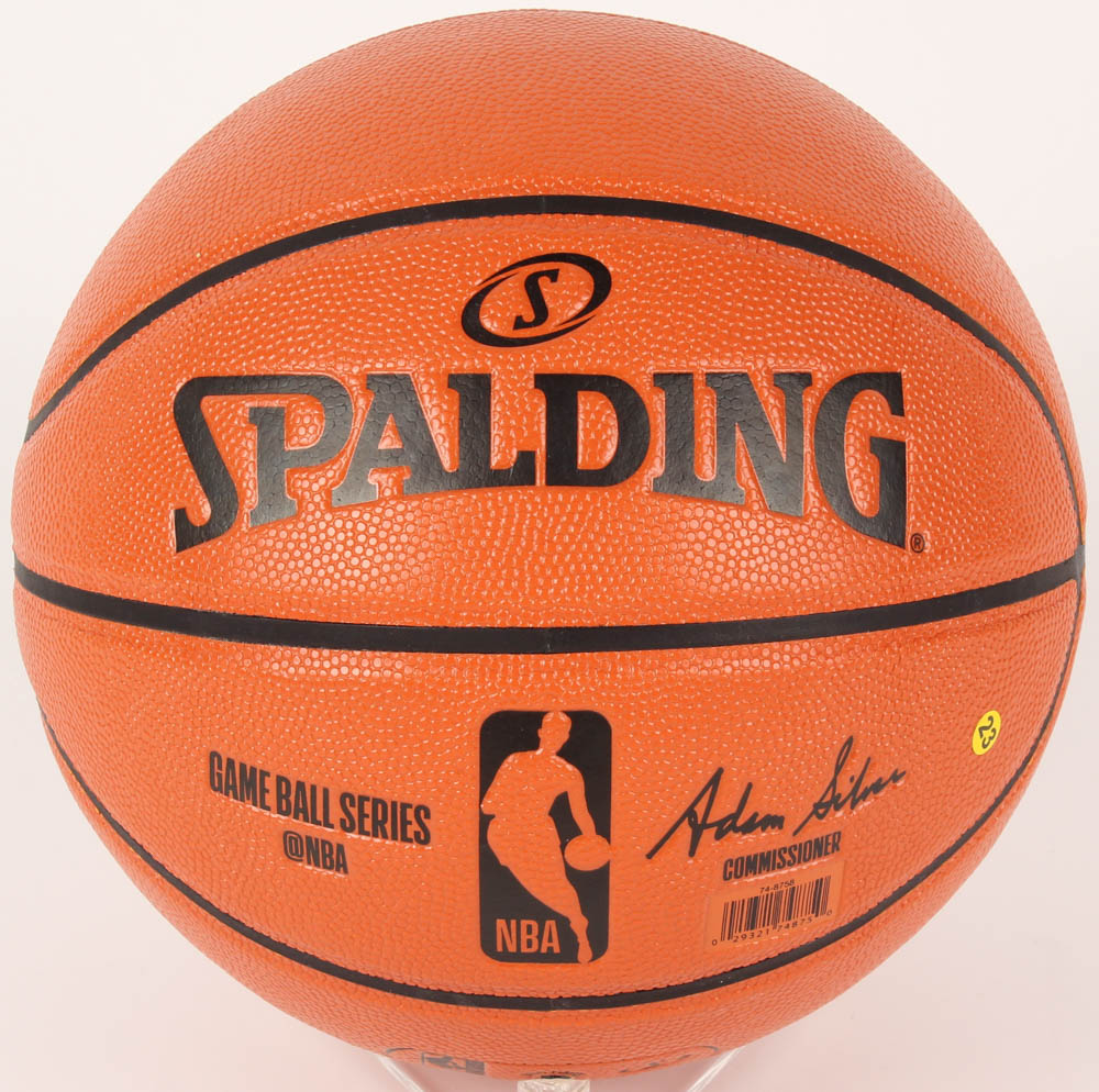 Spalding NBA Game Ball Series Basketball. Hand-signed in purple paint pen by Magic Johnson (Los Angeles Lakers, HOF).