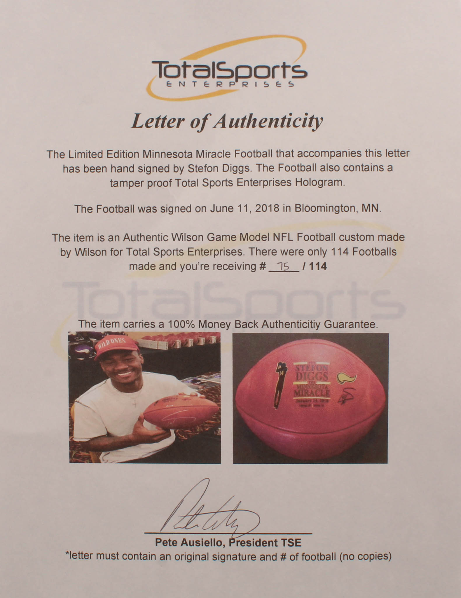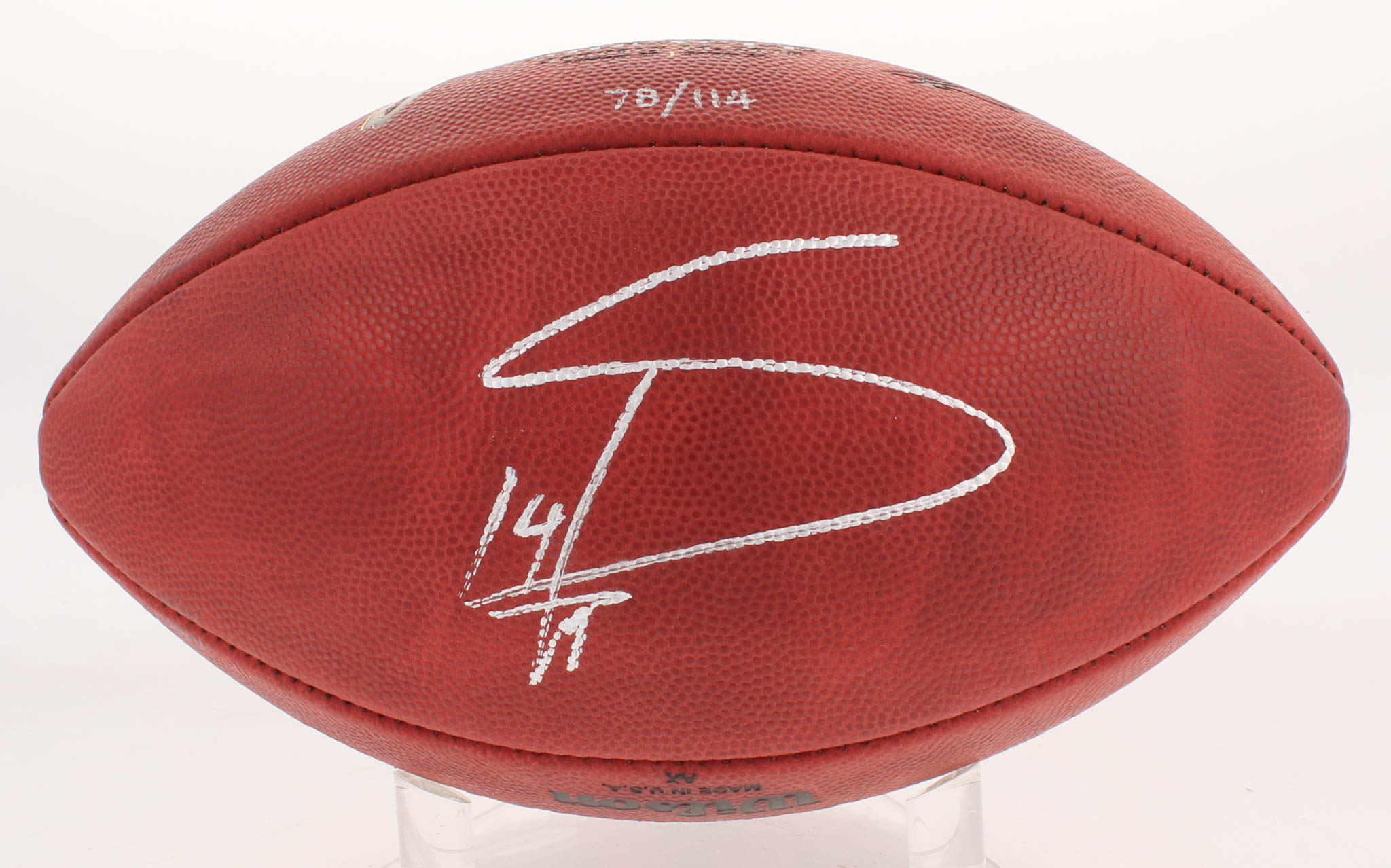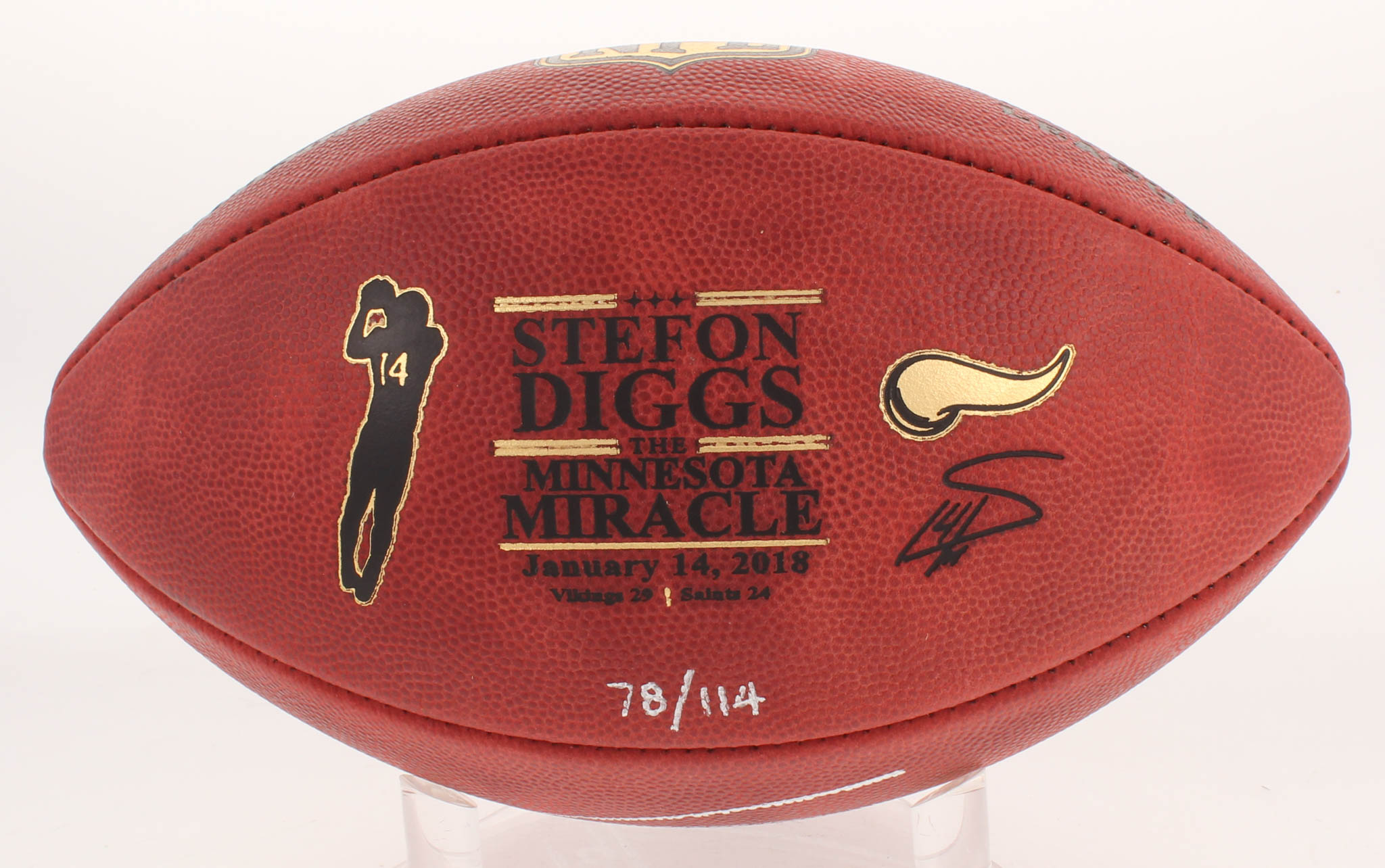 Wilson Official NFL The Duke "The Minnesota Miracle" logo football. Hand-signed in silver paint pen by Stefon Diggs (Minnesota Vikings). The football is limited edition out of #/114. Please note, you will be receiving a random limited edition number from the same edition run.