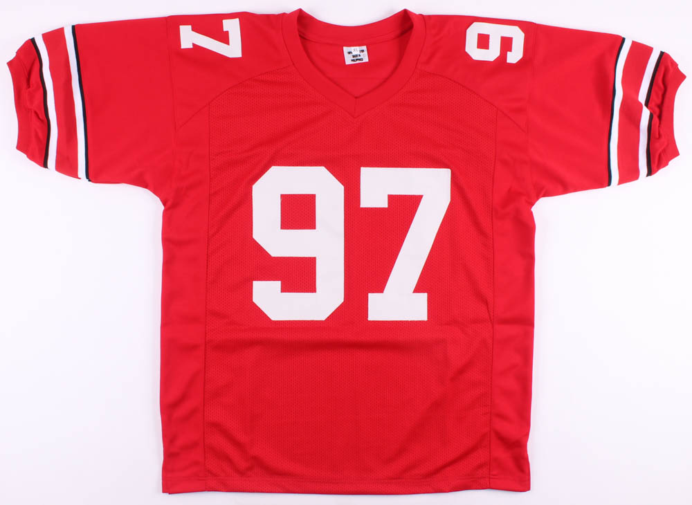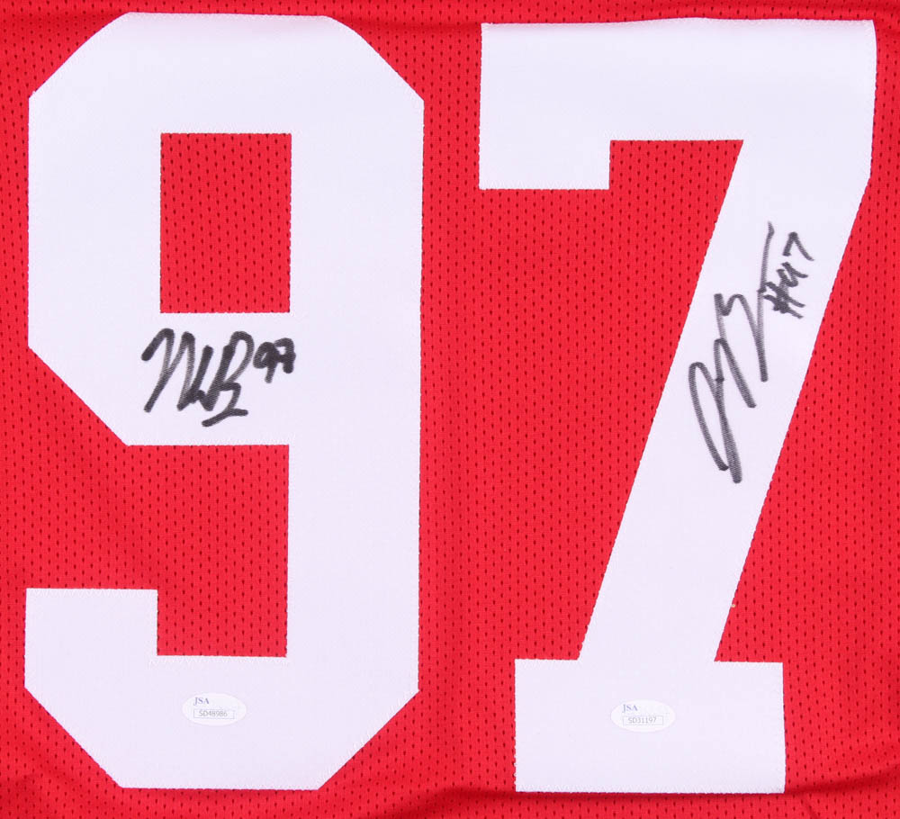 Custom on-field style jersey. Everything is sewn on, size XL. Hand-signed in black felt-tip pen by Joey Bosa and Nick Bosa.