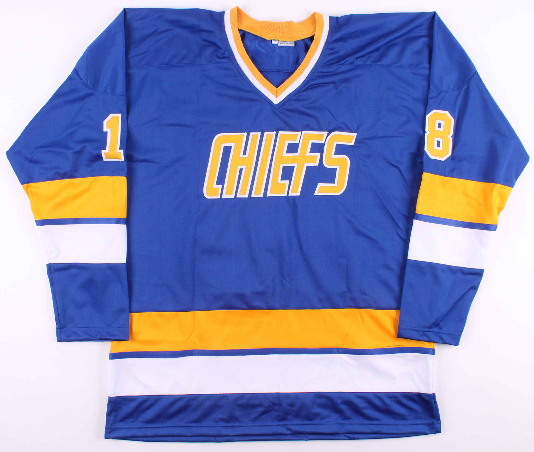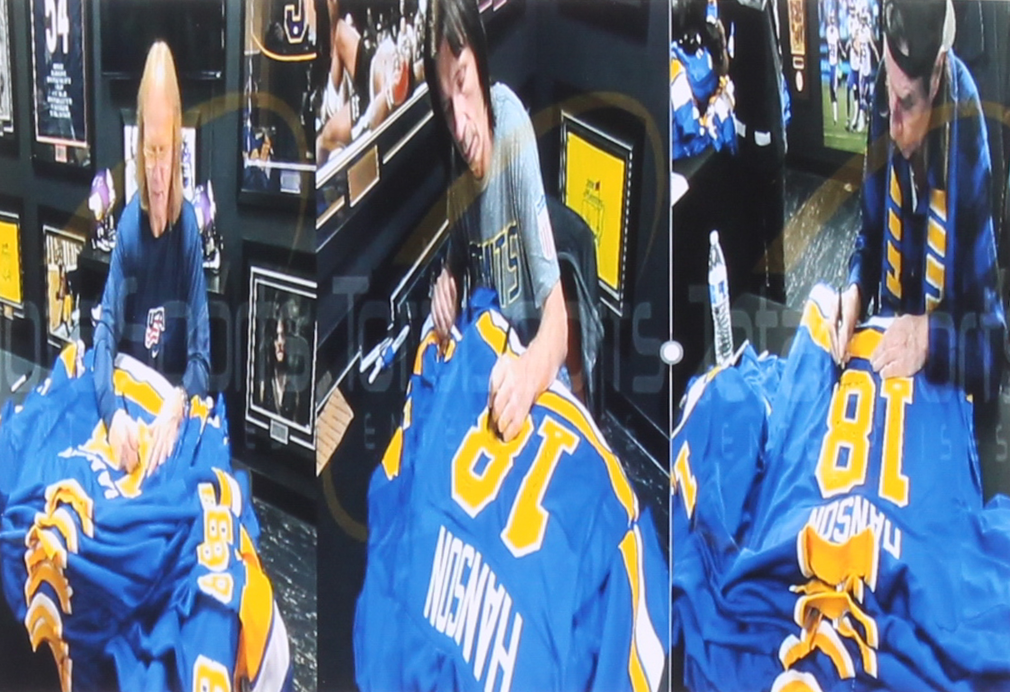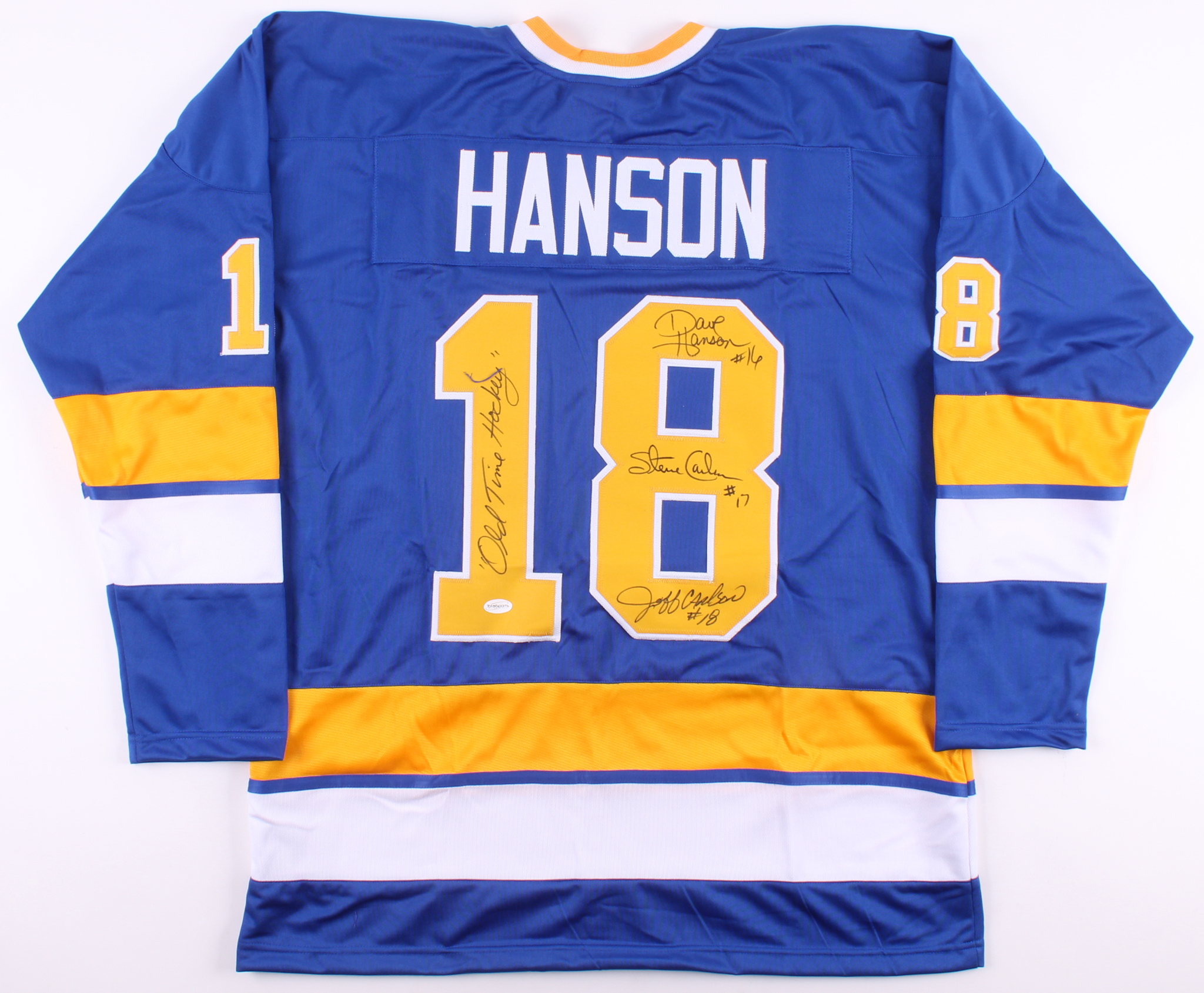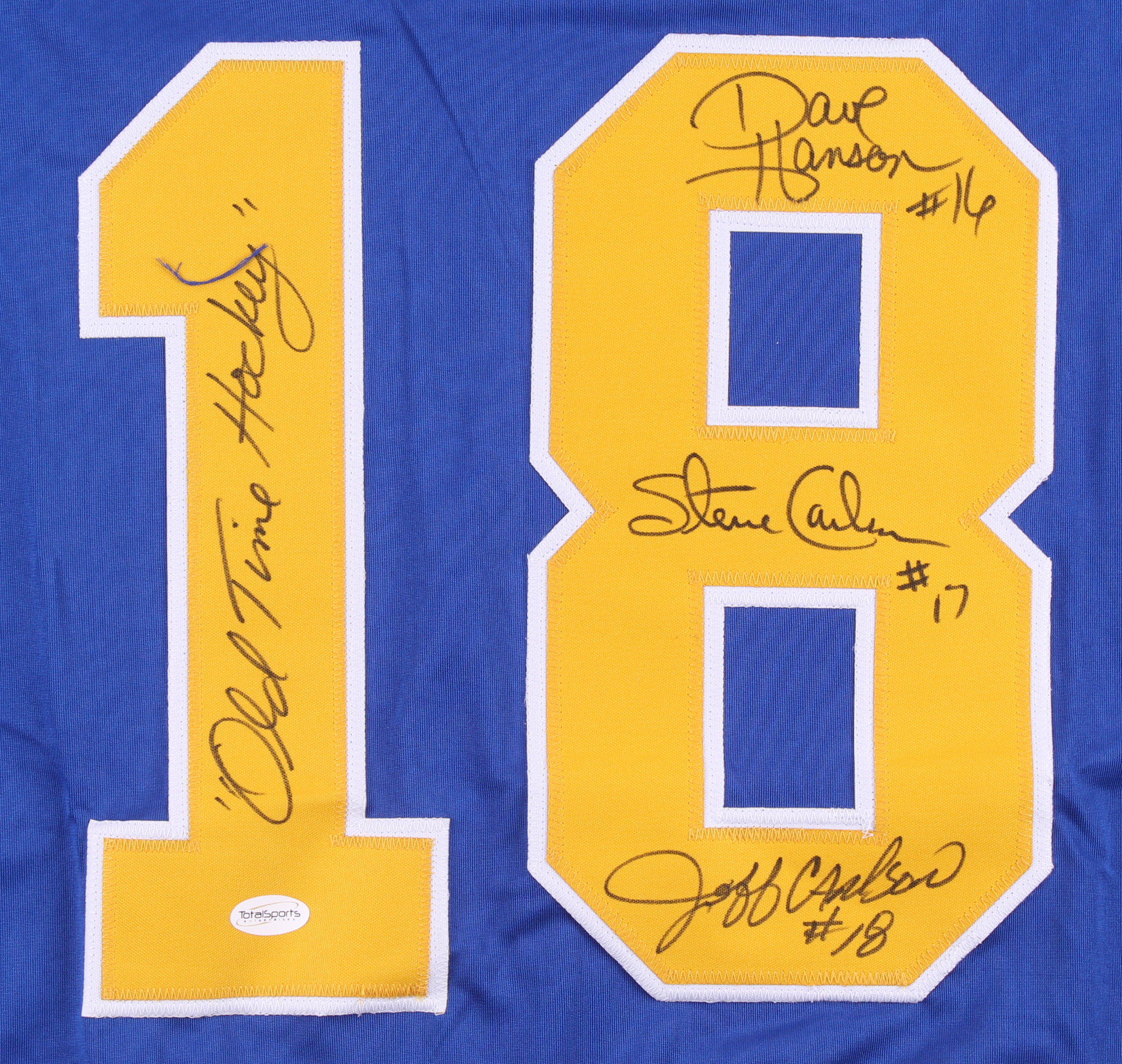 Custom on-ice style jersey. Everything is sewn on, size XL. Hand-signed and inscribed in black felt-tip pen by David Hanson (Jack Hanson), Jeff Carlson (Jeff Hanson) and Steve Carlson (Steve Hanson).