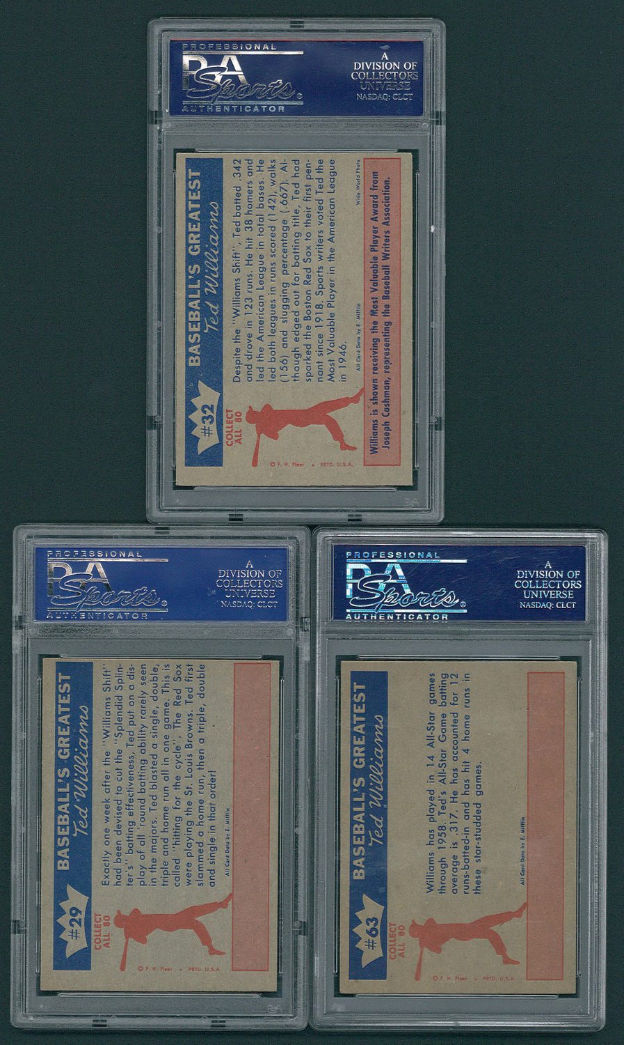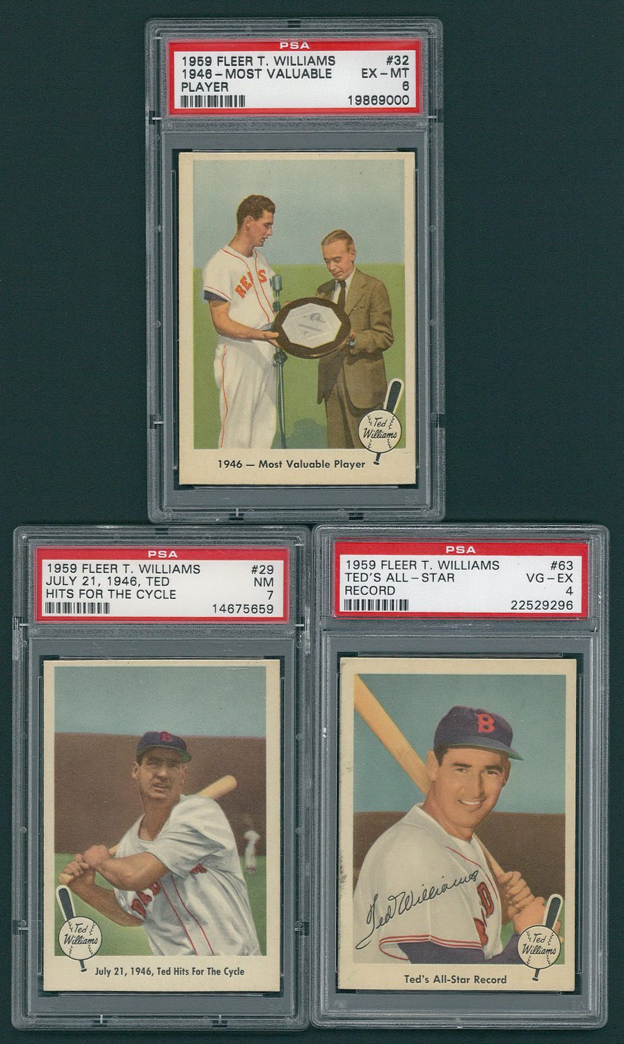 Lot of (3) 1959 Fleer Ted Williams Baseball Cards with #63 AS Record w/Auto (PSA 4), #32 Most Valuable Player (PSA 6) & #29 Ted Hits for Cycle (PSA 7)