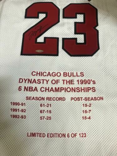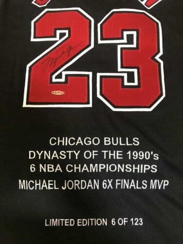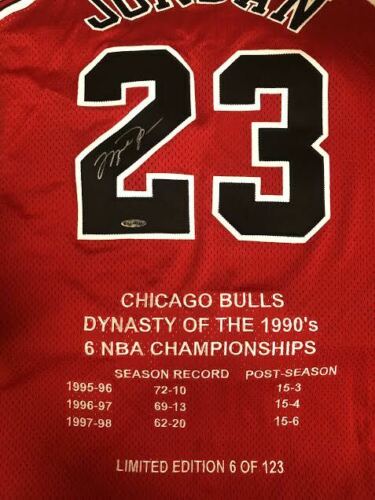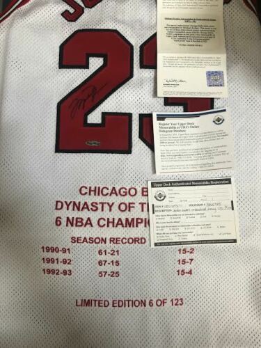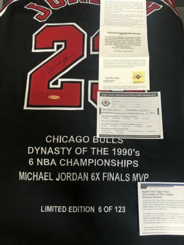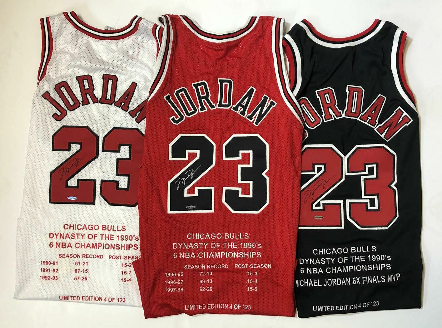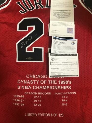 This has to be the hardest Jordan collectible to come by. Up for auction is a three jersey set autographed by Michael Jordan. Each jersey has been hand signed by Michael Jordan and authenticated by Upper Deck Authenticated. In this set, you have the white home jersey, the red away jersey and the black alternate jersey. Each jersey is embroidered with some of Michael Jordan's career stats. The most impressive stat is his 6x championships. Although this is a set of three jerseys, each jersey comes with its own hologram as well as its own certificate of authenticity from Upper Deck Authenticated. Best of all, these are original Nike jerseys, not the Mitchell & Ness reproduction. This series is limited to 123 and you will receive number "6" from this sold out edition.