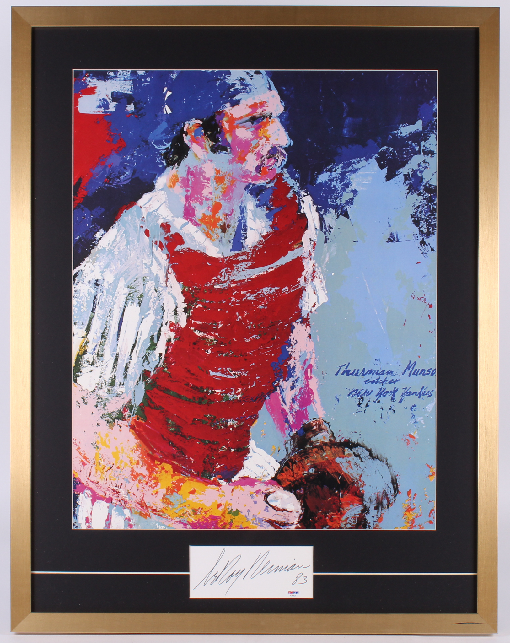 Custom frame measures 28" x 36" in size and features a cut that has been hand-signed in black felt-tip pen by LeRoy Neiman (D. 2012). Display also features a Neiman print of Thurman Munson.
