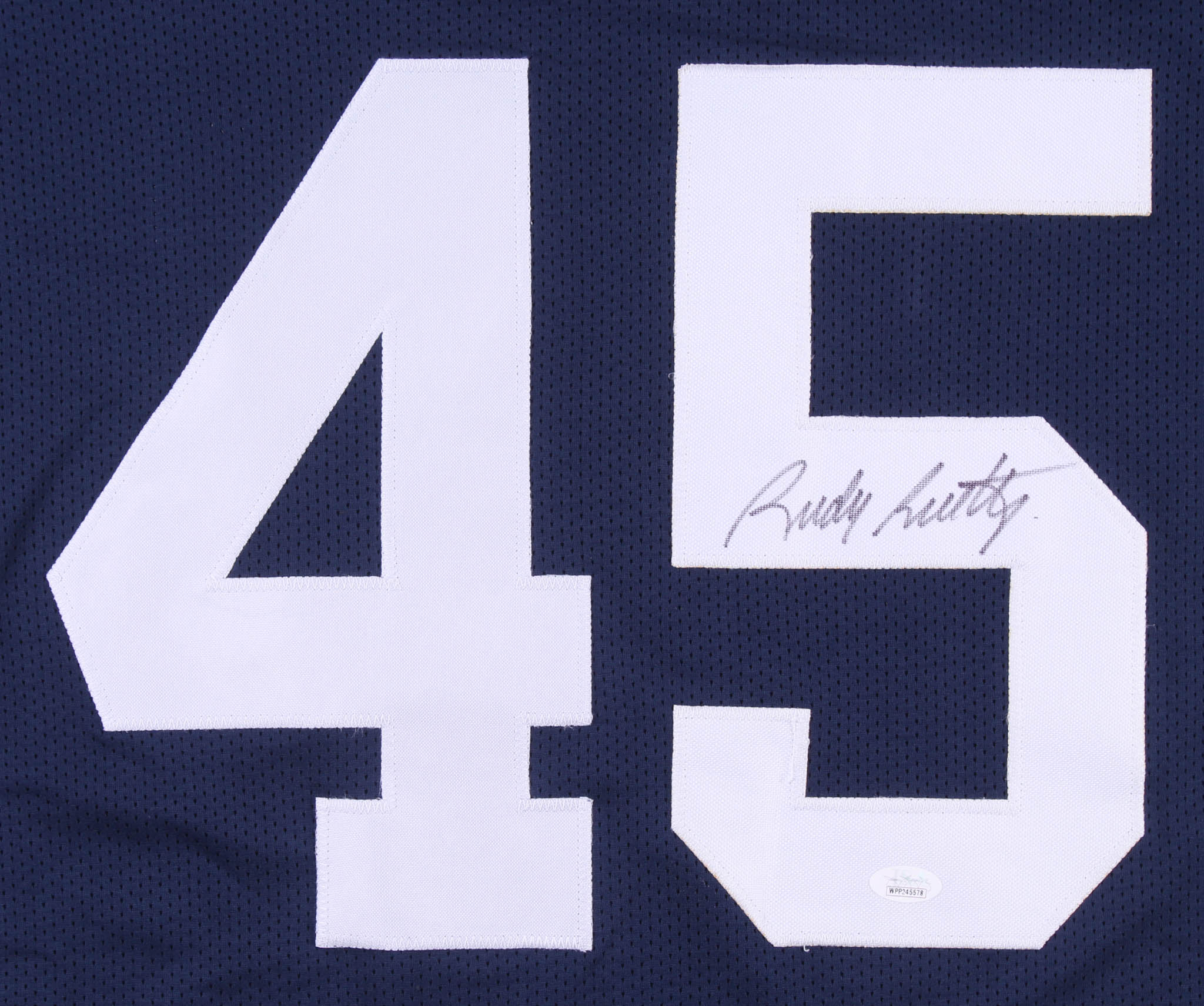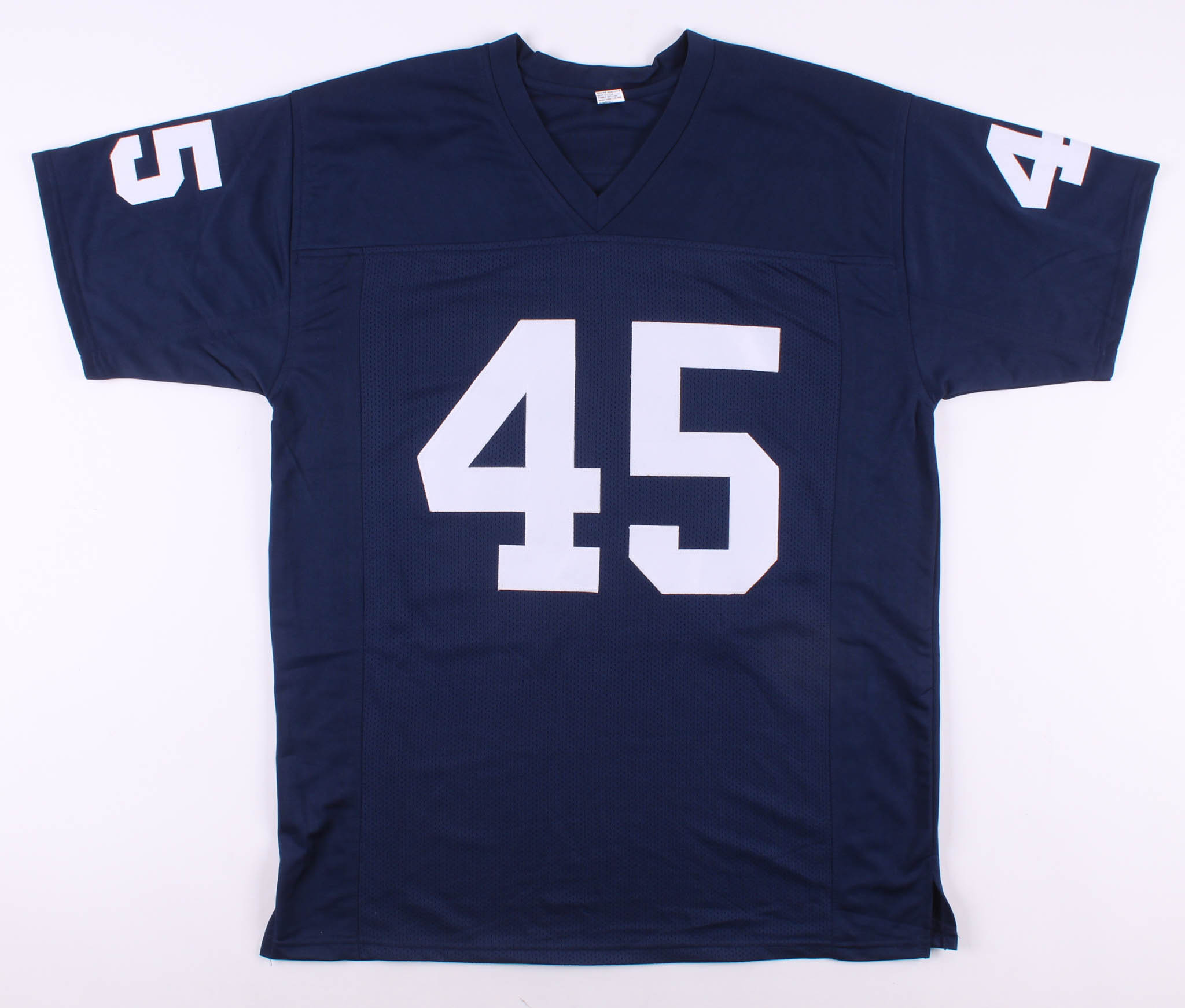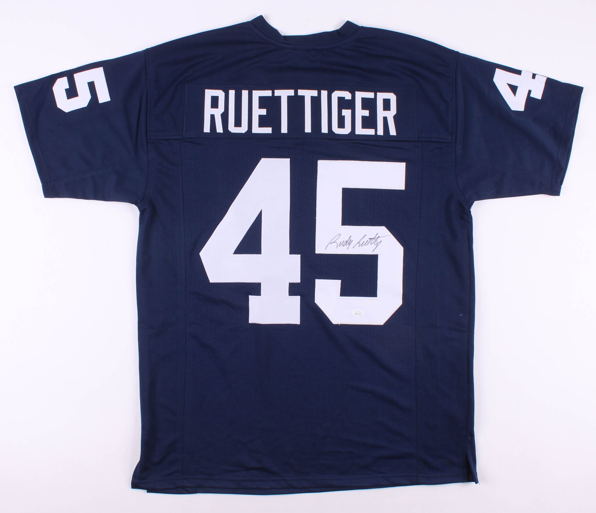 Custom on-field style jersey. Everything is sewn on, size XL. Hand-signed in black felt-tip pen by Rudy Ruettiger.