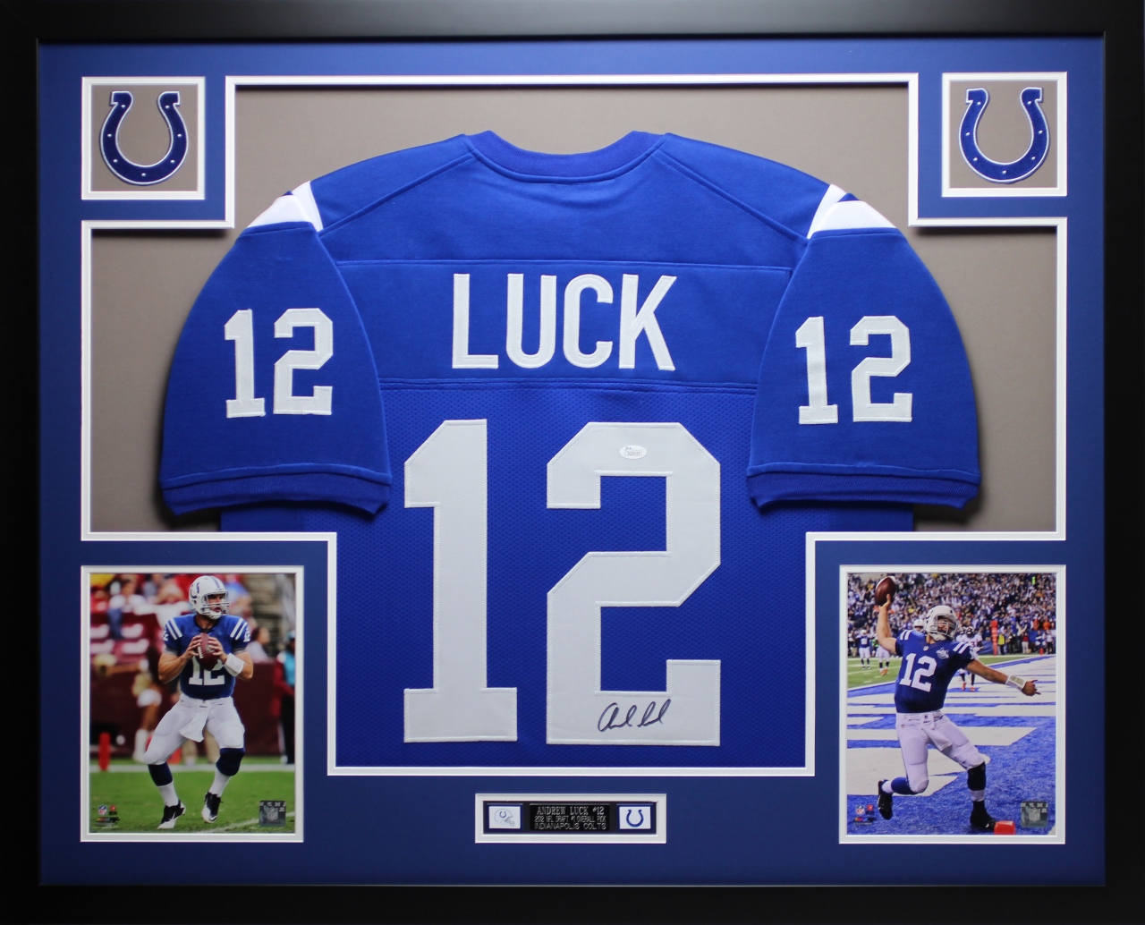 A beautifully framed autographed Andrew Luck Colts Jersey. The autograph was certified by JSA and includes a sticker on the Jersey and a matching certifcate attached to the back of the frame.