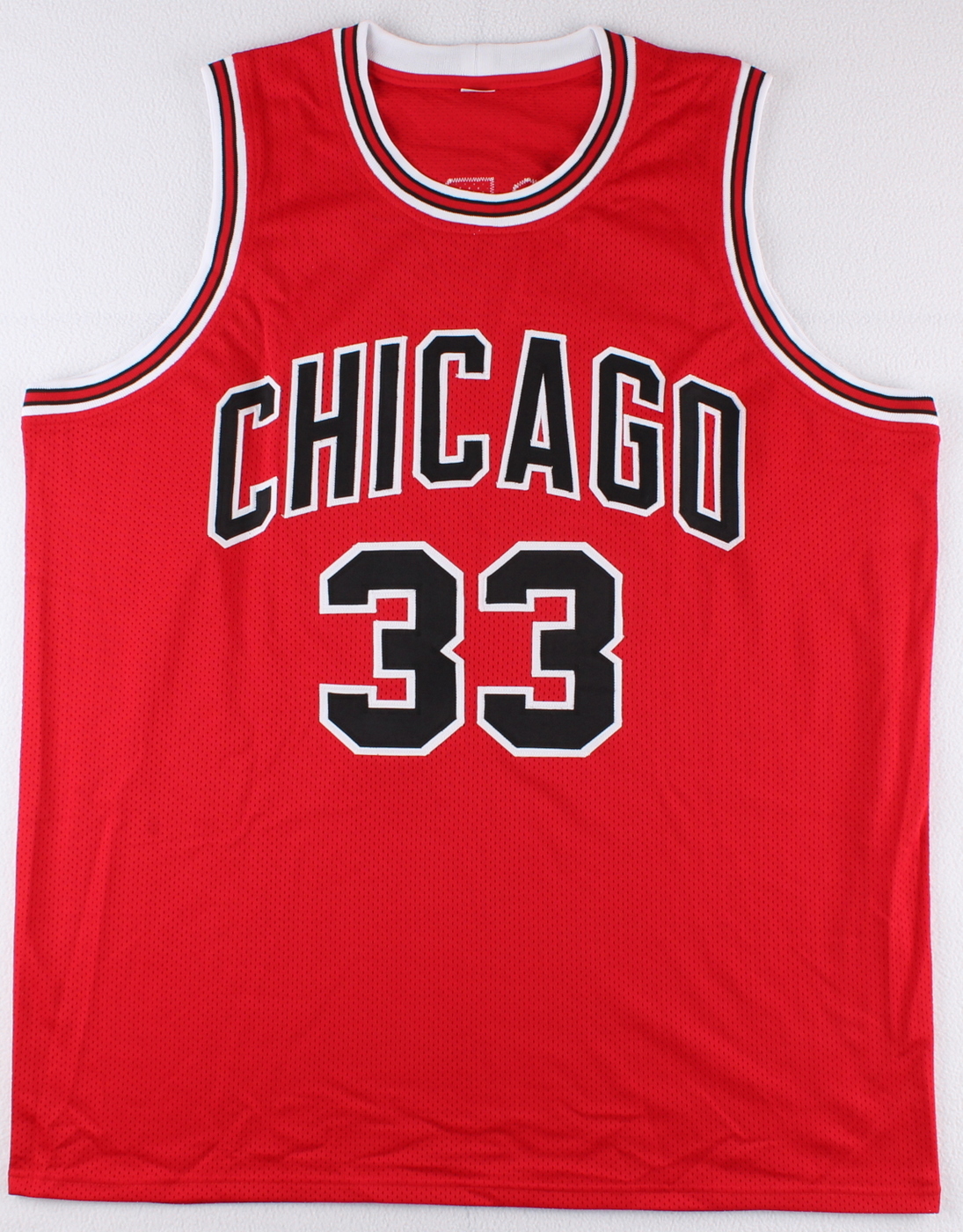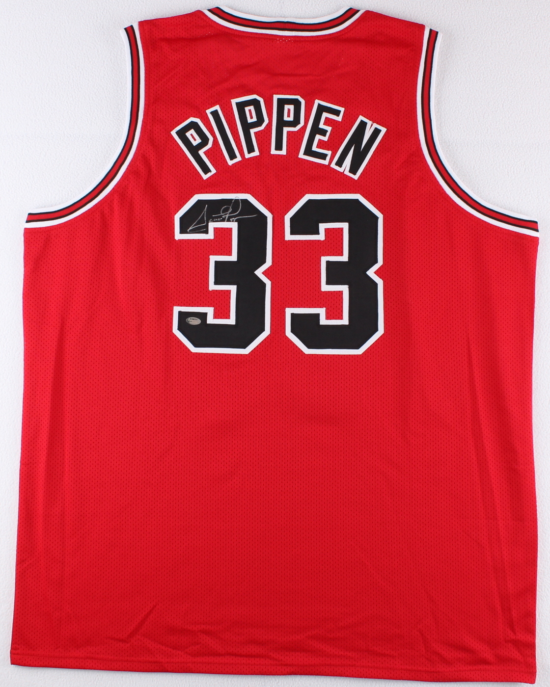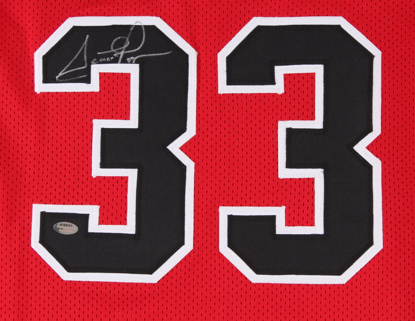 Custom on-court style jersey. Everything sewn on, size XL. Hand-signed in silver paint pen by Scottie Pippen. The autograph includes an official Schwartz Sports Hologram and matching COA for authenticity purposes.