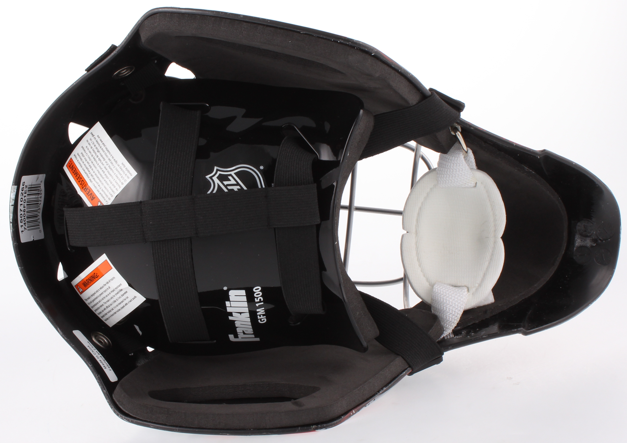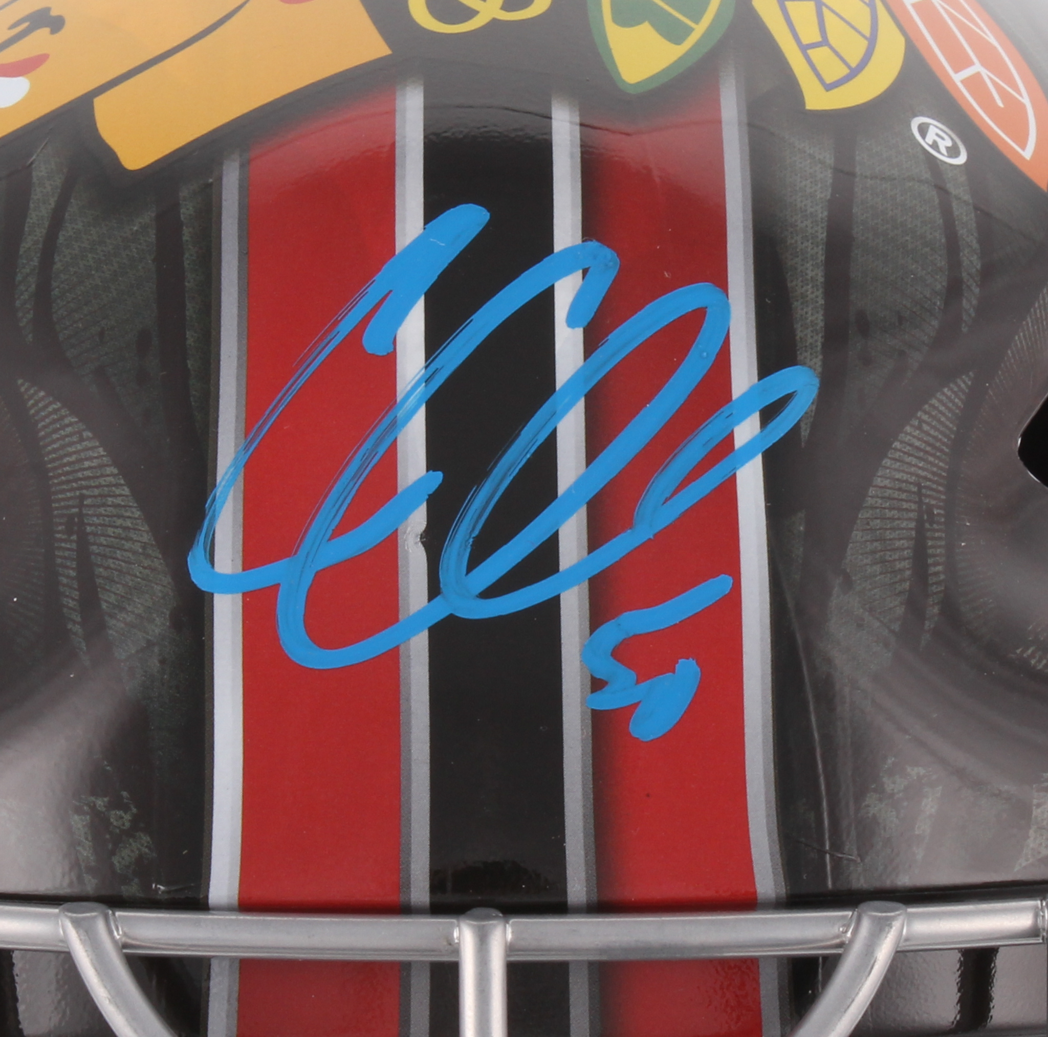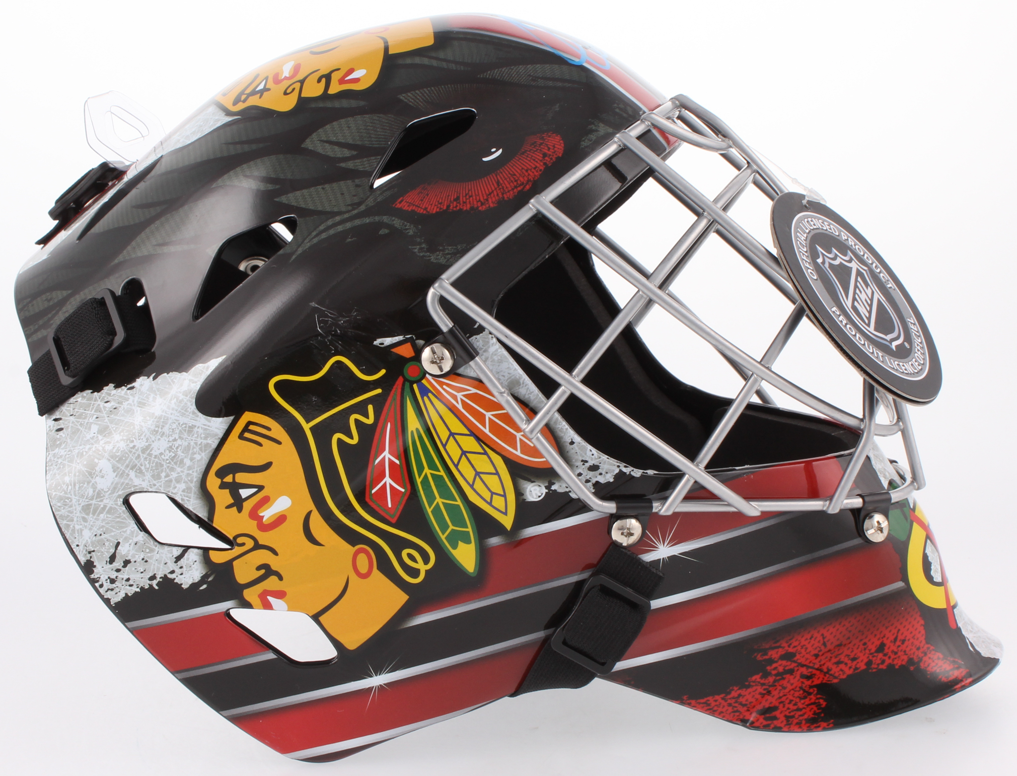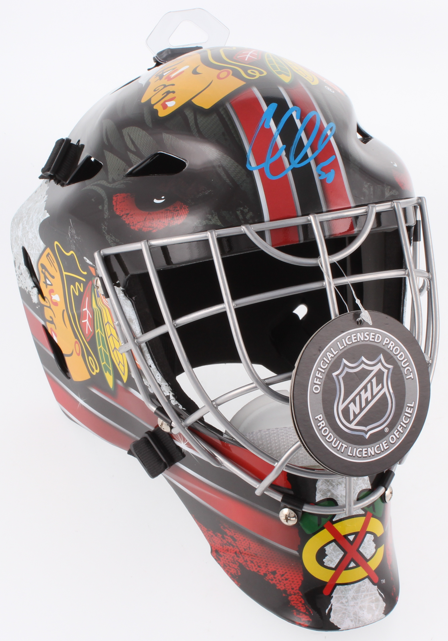 Franklin Chicago Blackhawks full-size goalie mask. Hand-signed in blue paint pen by Corey Crawford.