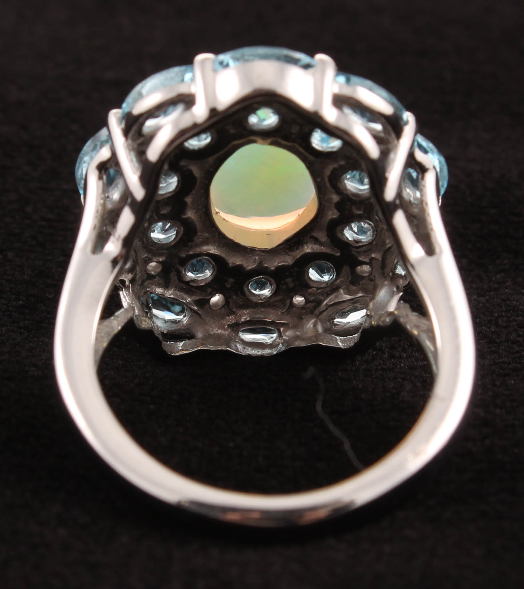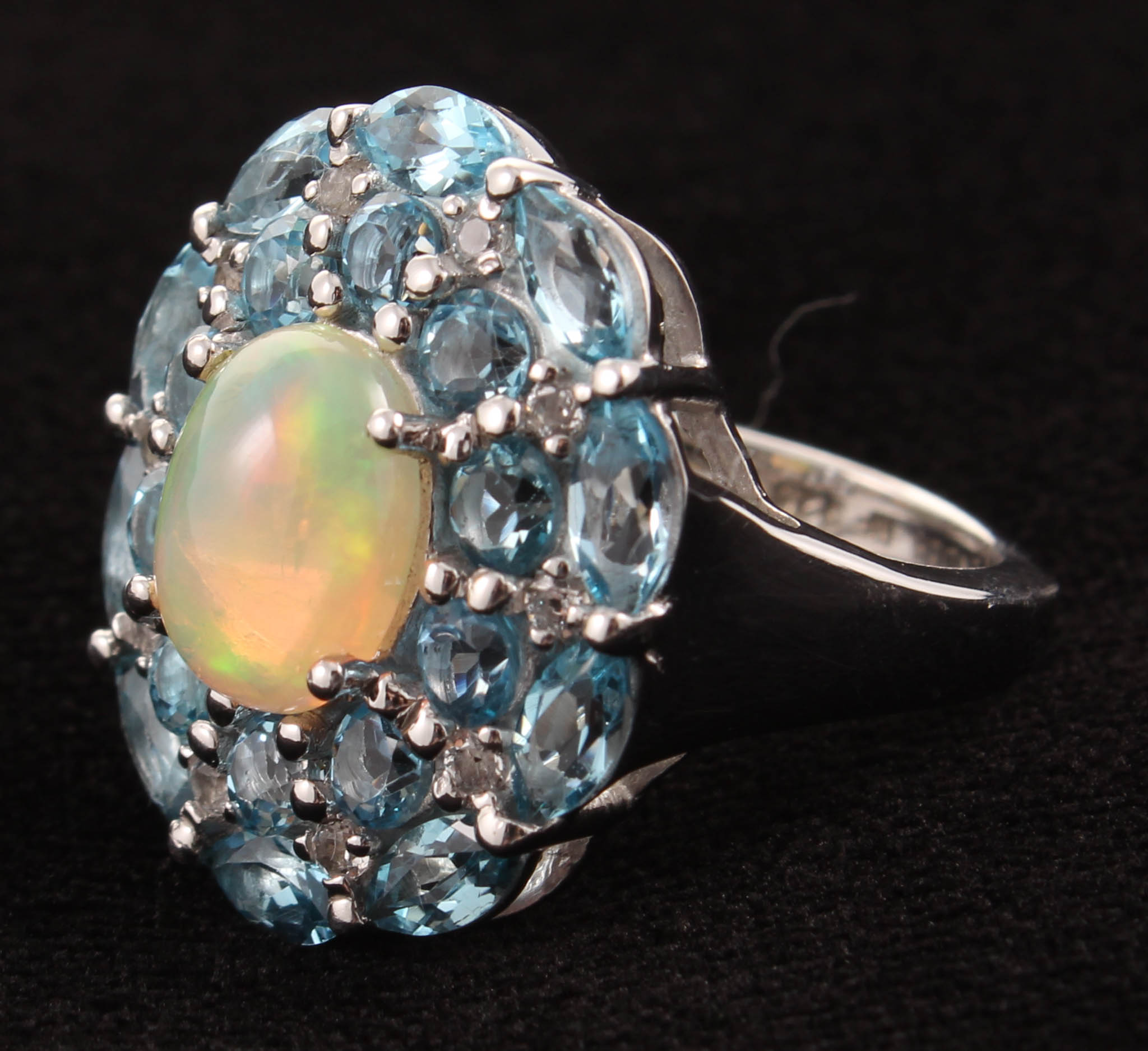 Make a statement and make it beautifully with this striking design from the Pangea Mines Treasured Gems Collection. Beautifully crafted in gleaming anti-tarnish rhodium over sterling silver and adorned with a large Ethiopian opal surrounded by halos of Swiss blue and white topaz, this ring is truly eye catching.