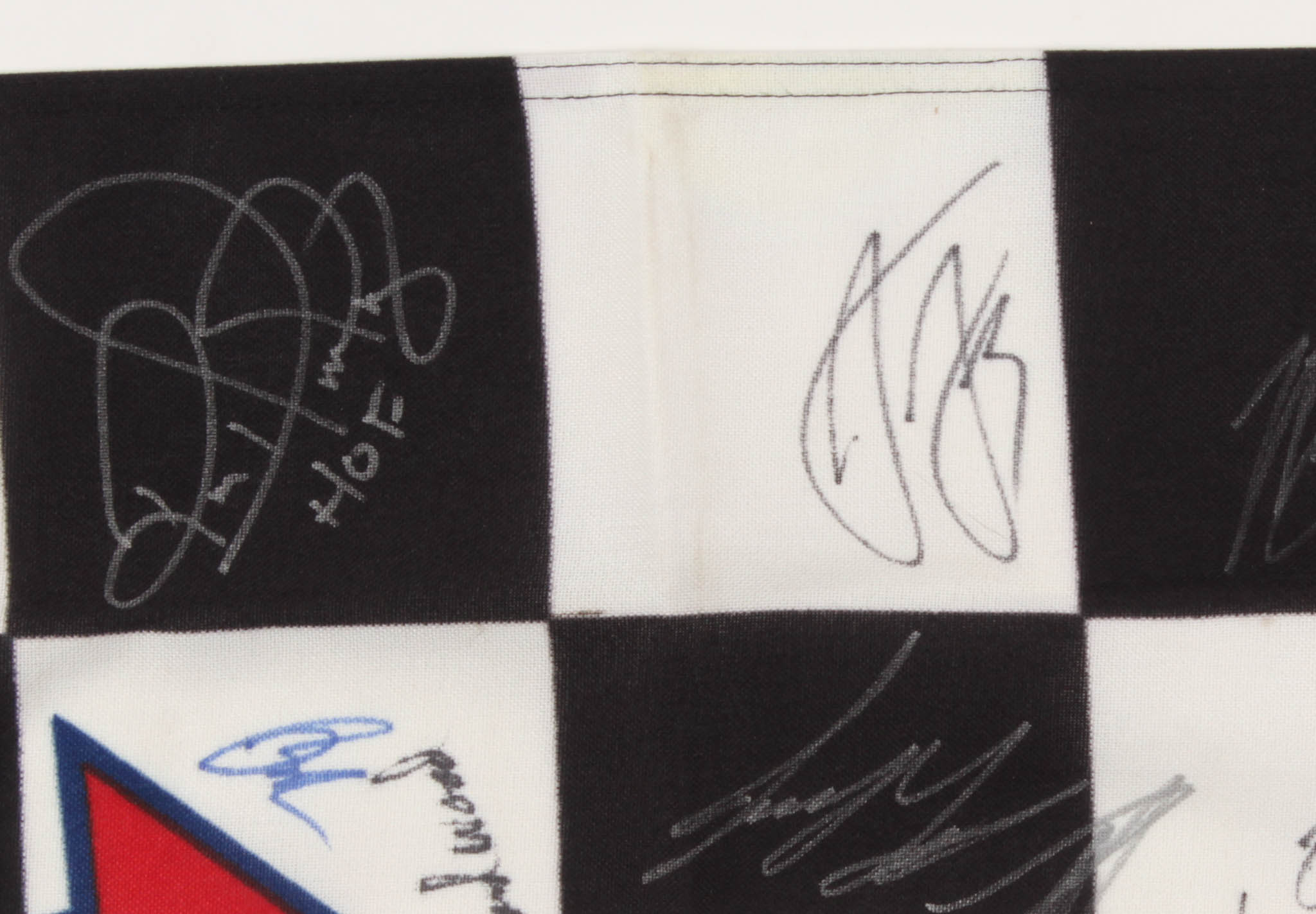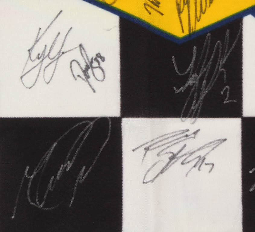 NASCAR Sunoco Checkered Flag Signed by (44) with Jimmie Johnson, Martin Truex Jr., Joey Logano, Kevin Harvick, Denny Hamlin, Brad Keselowski (JSA ALOA)