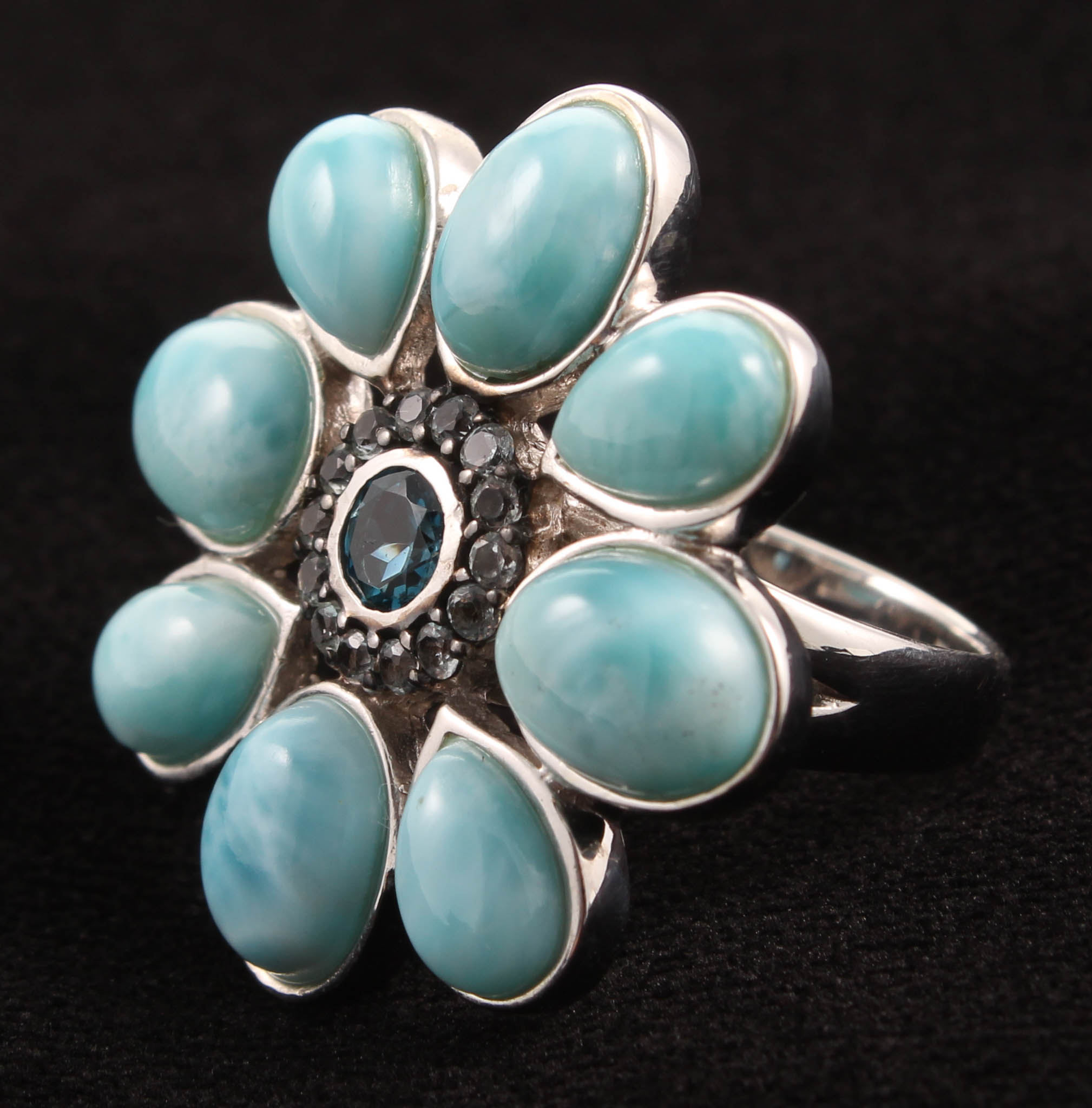 As delightful and welcome as the first flowers of spring, Pangea Mines lovely ring from the Royal Island collection is fully abloom in stunning color. Beautifully crafted in gleaming rhodium over fine sterling, this charming ring is embellished with beautiful genuine Dominican larimar petals complemented by sparkling London blue topaz.