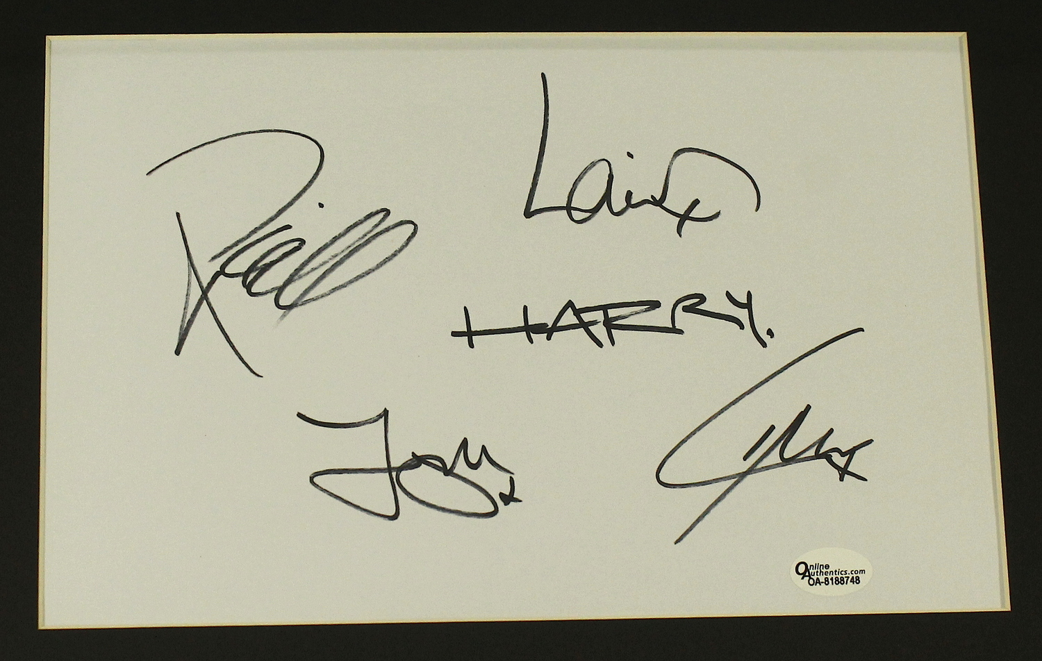 Custom framed display measures 17" x 21" in size and features a 5.5 x 8.5" cut that has been hand-signed in black felt-tip pen by Louis Tomlinson, Harry Styles, Liam Payne, Zayn Malik & Niall Horan (One Direction Band). The autograph includes an official Online Authentics hologram and COA for authenticity purposes.
