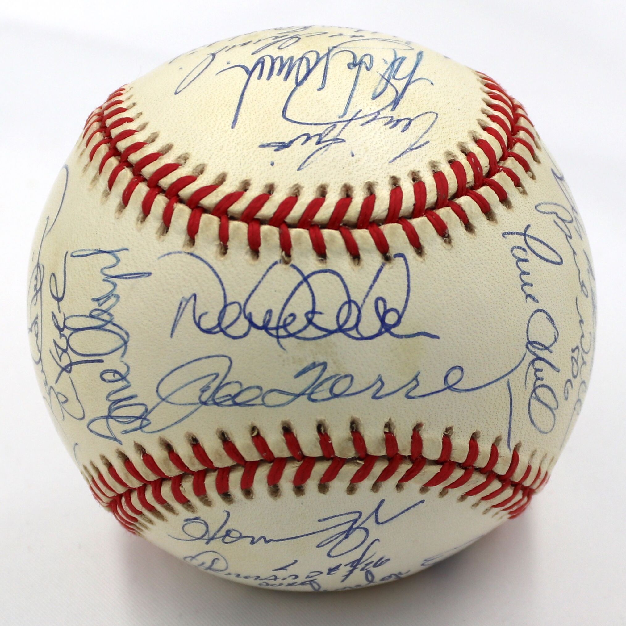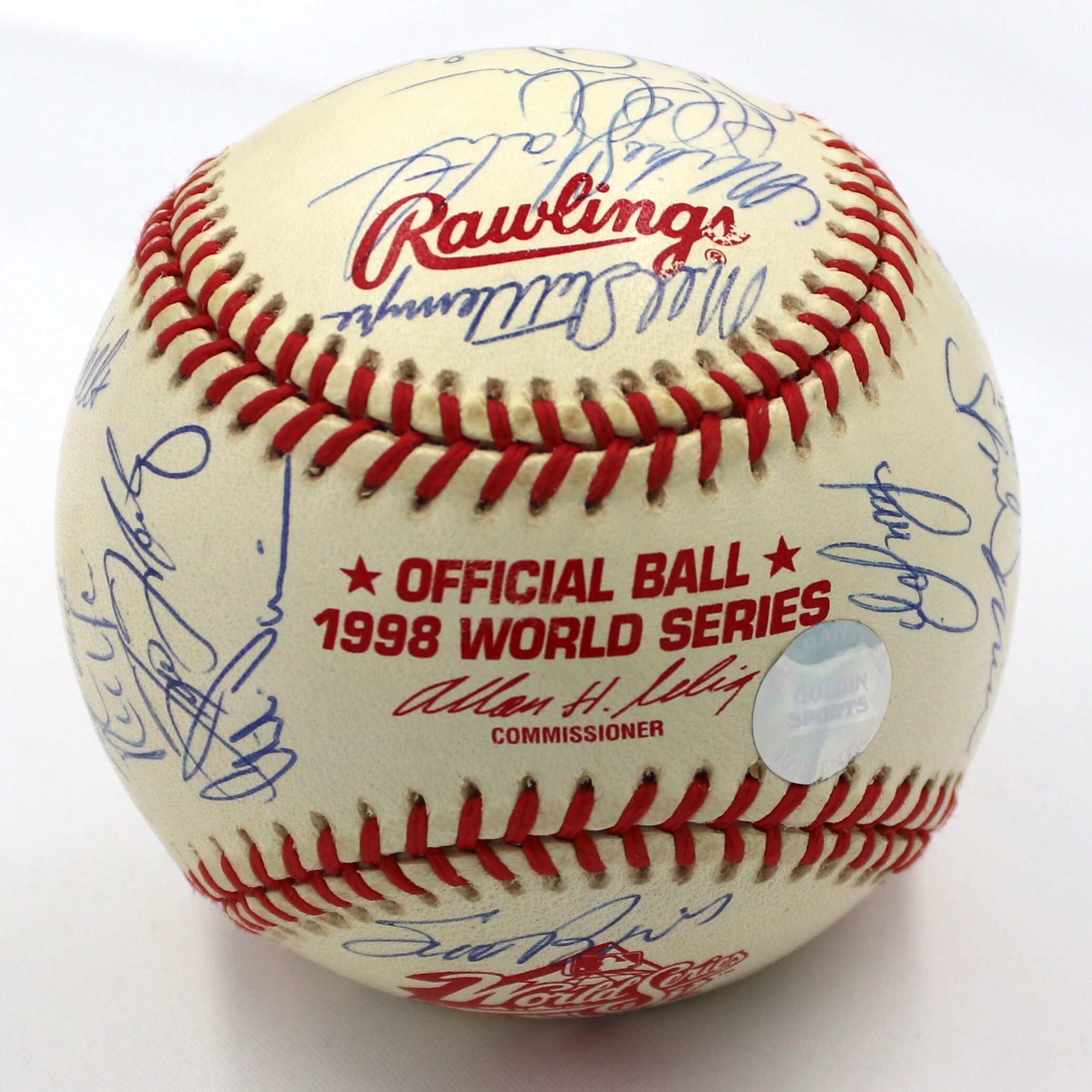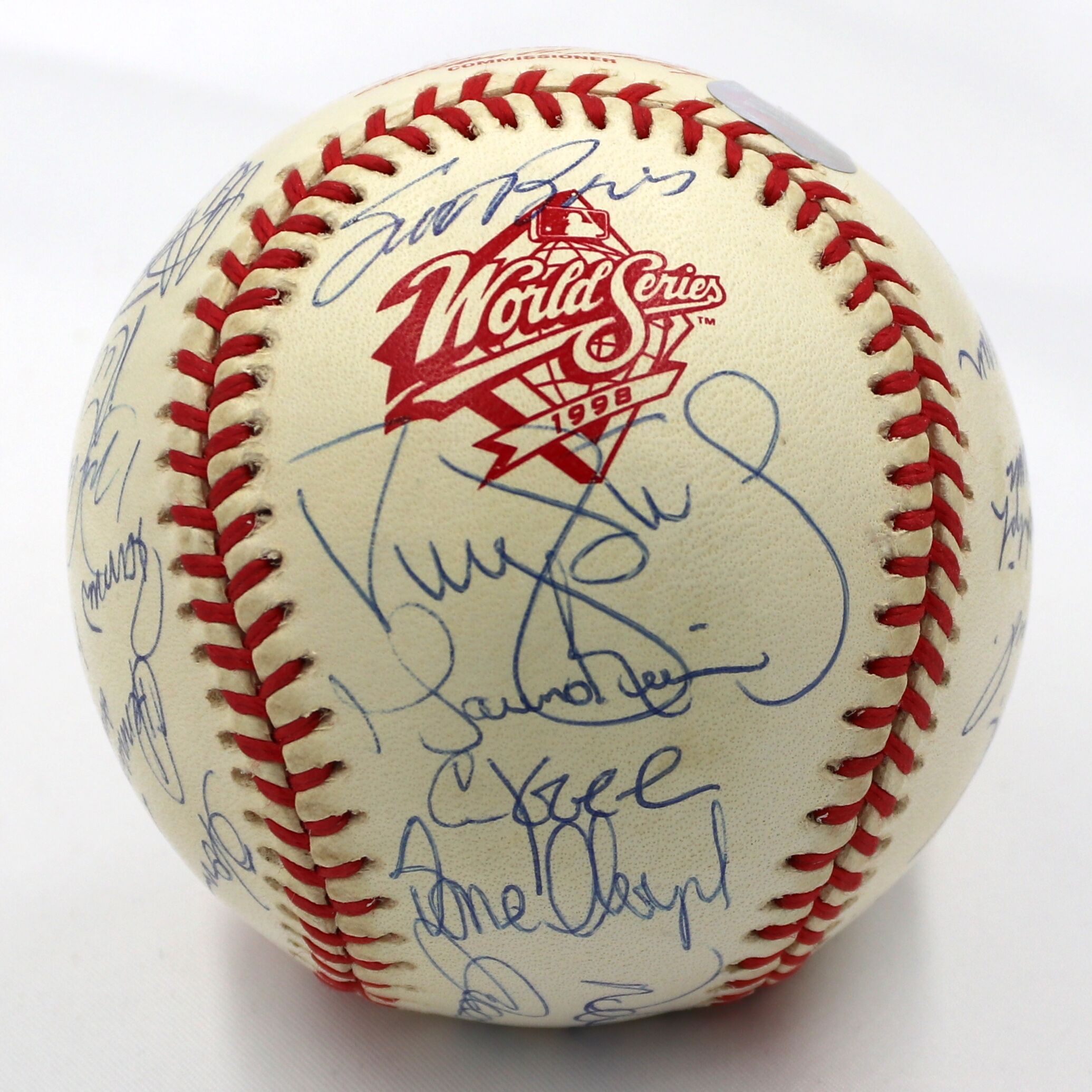 Rawlings Official 1998 World Series baseball. Baseball has been hand-signed in blue ink pen by (29) of the 1998 New York Yankees with Joe Torre, Derek Jeter, Mariano Rivera, Andy Pettitte, Bernie Williams, Paul O'Neill, Jorge Posada, Orlando Hernandez, David Wells, Tino Martinez, Darryl Strawberry, Scott Brosius, and (17) others. Please note, the baseball shows signs of natural toning.