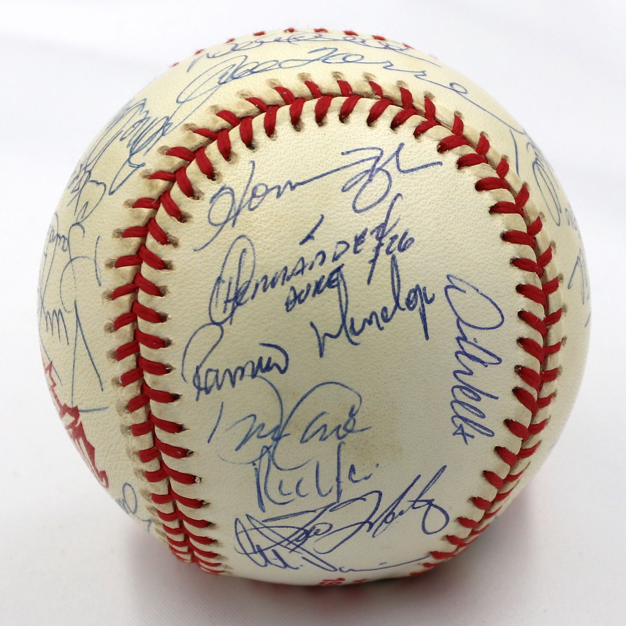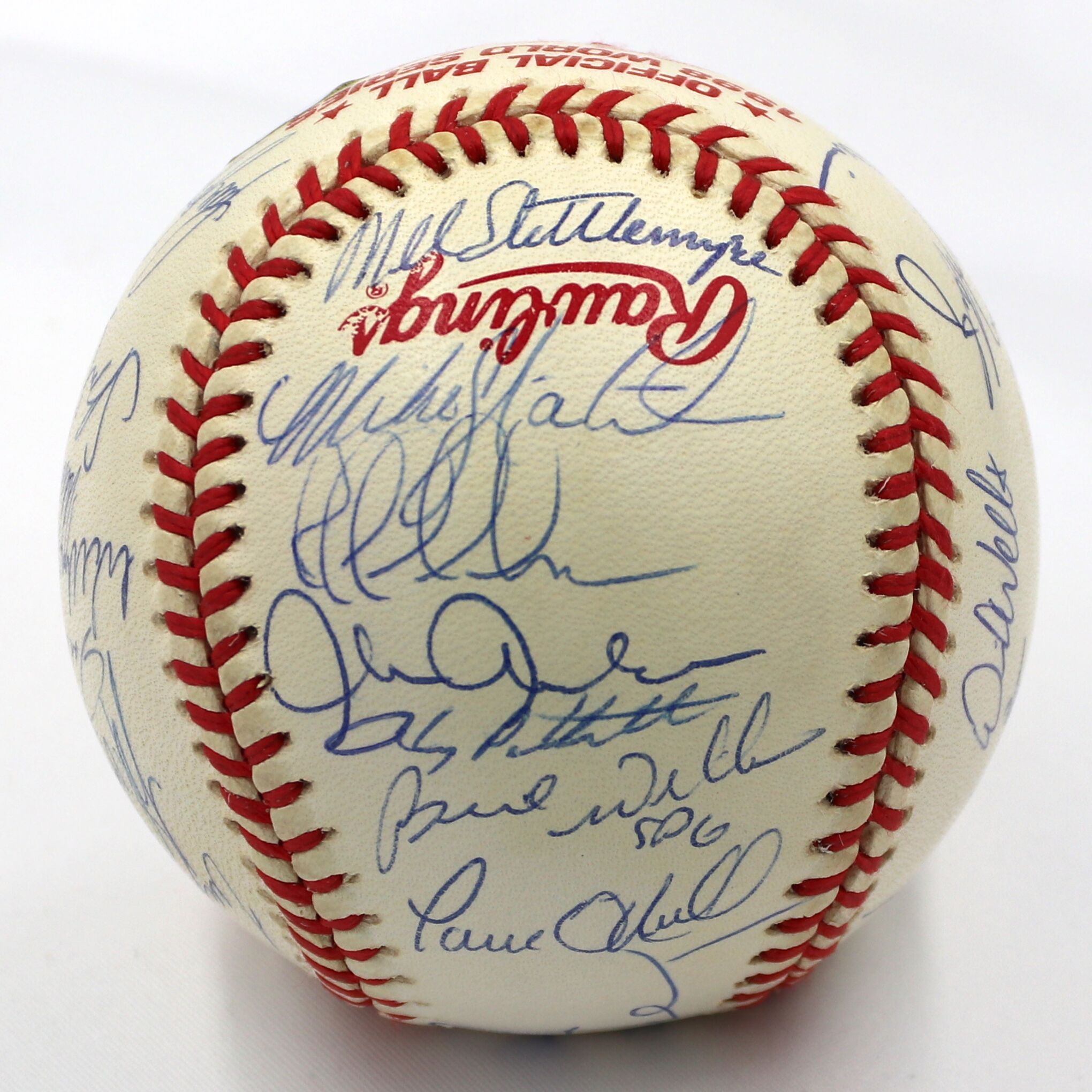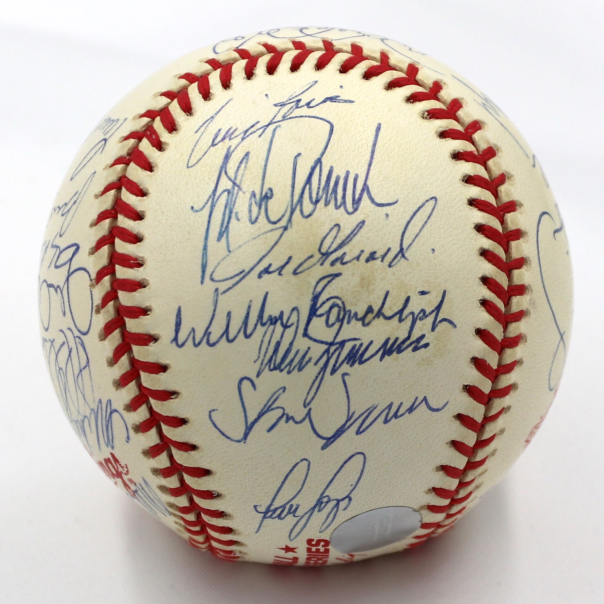 Rawlings Official 1998 World Series baseball. Baseball has been hand-signed in blue ink pen by (29) of the 1998 New York Yankees with Joe Torre, Derek Jeter, Mariano Rivera, Andy Pettitte, Bernie Williams, Paul O'Neill, Jorge Posada, Orlando Hernandez, David Wells, Tino Martinez, Darryl Strawberry, Scott Brosius, and (17) others. Please note, the baseball shows signs of natural toning.