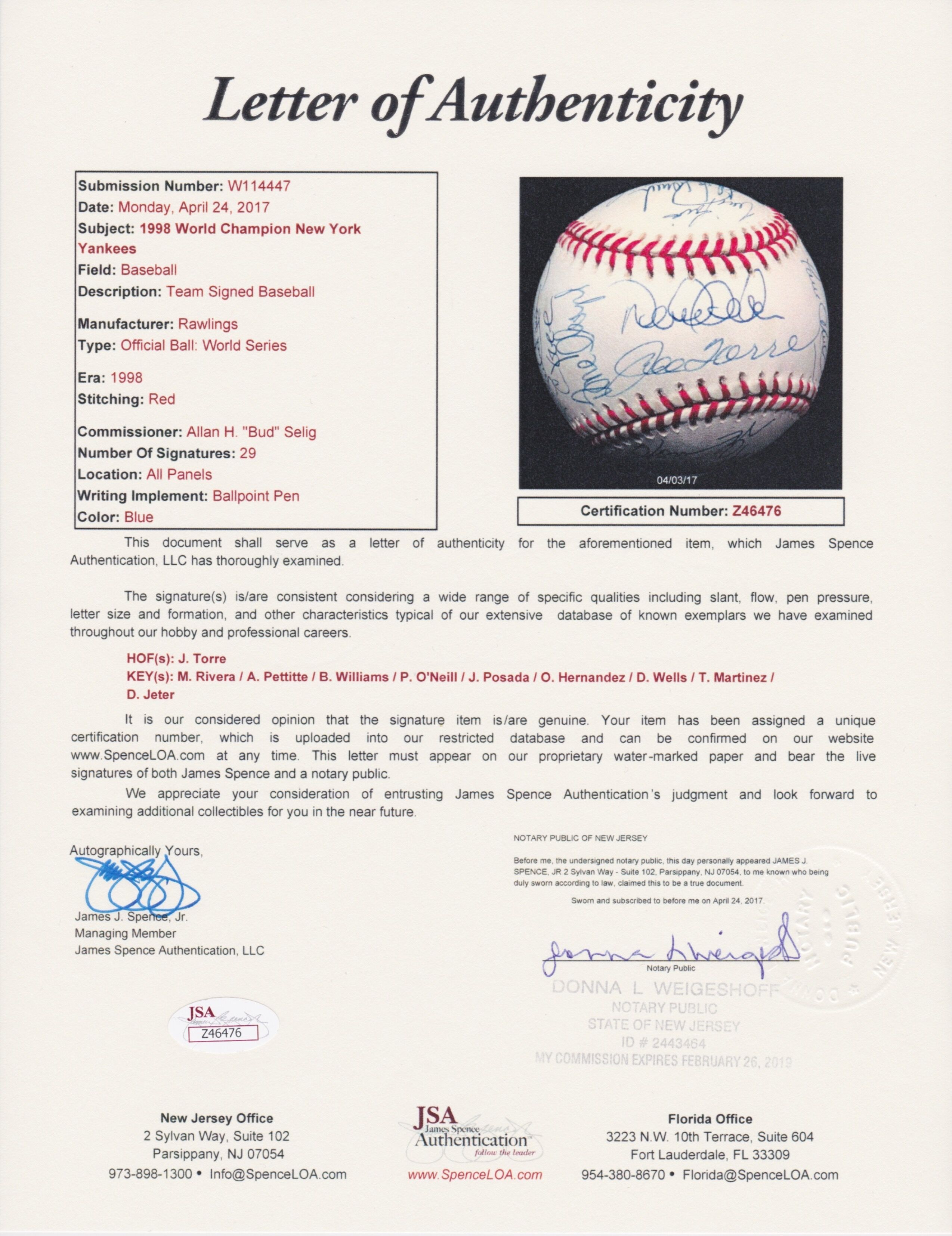 New York Yankees 1998 World Series Baseball Team-Signed by (29) with Joe Torre, Derek Jeter, Mariano Rivera, Andy Pettitte (JSA LOA)