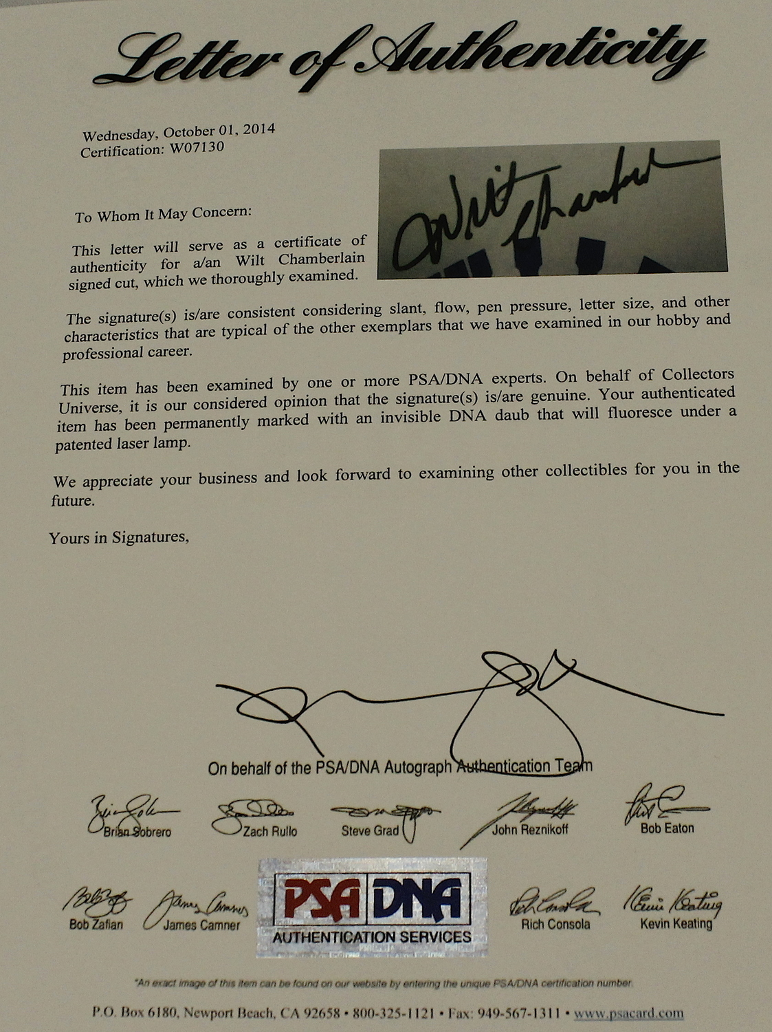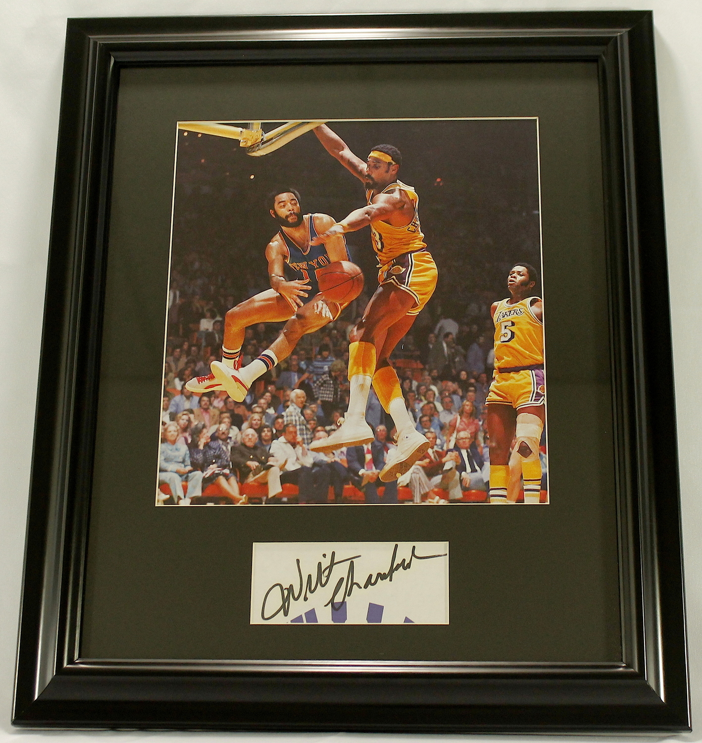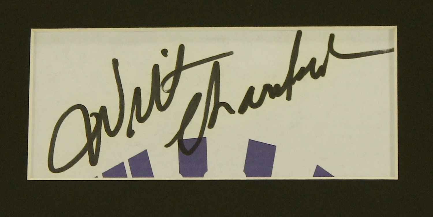 Custom framed display measures 15" x 18" in size and features a 2" x 4.5" cut that has been hand signed in black felt-tip pen by Wilt Chamberlain (D 1999, Warriors HOF). The autograph includes an official PSA/DNA hologram and matching LOA for authenticity purposes.