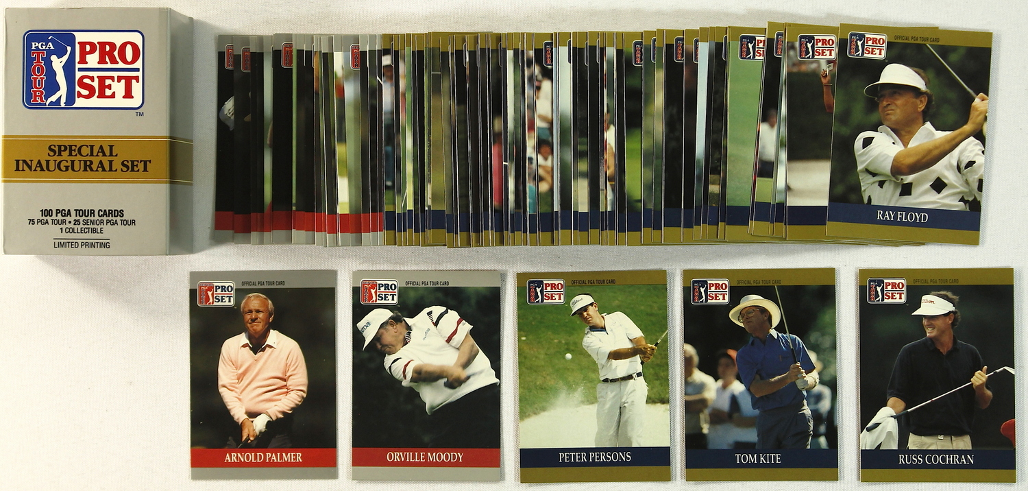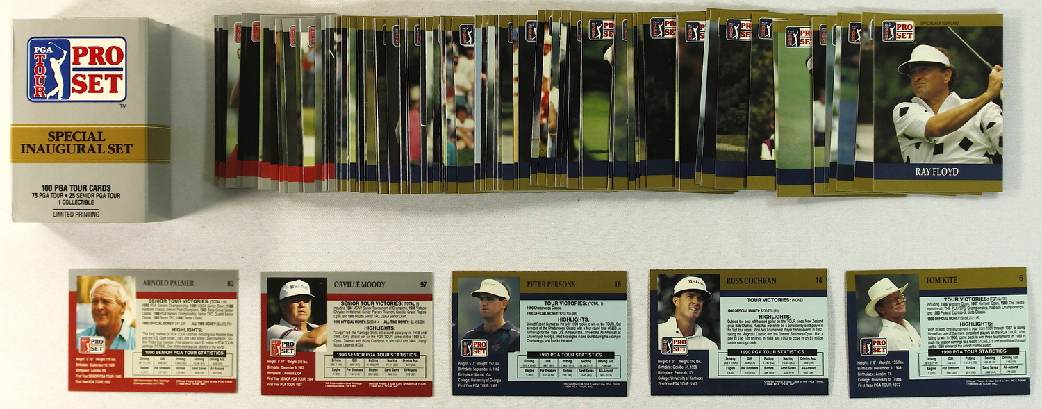 Complete Set of (100) 1990 PGA Tour Pro Set Gold Special Inaugural Set Cards. Lot includes Arnold Palmer, Peter Persons, Tom Kite, Russ Cochran, Ray Floyd and others. Please see scans below for details regarding the condition of the card.