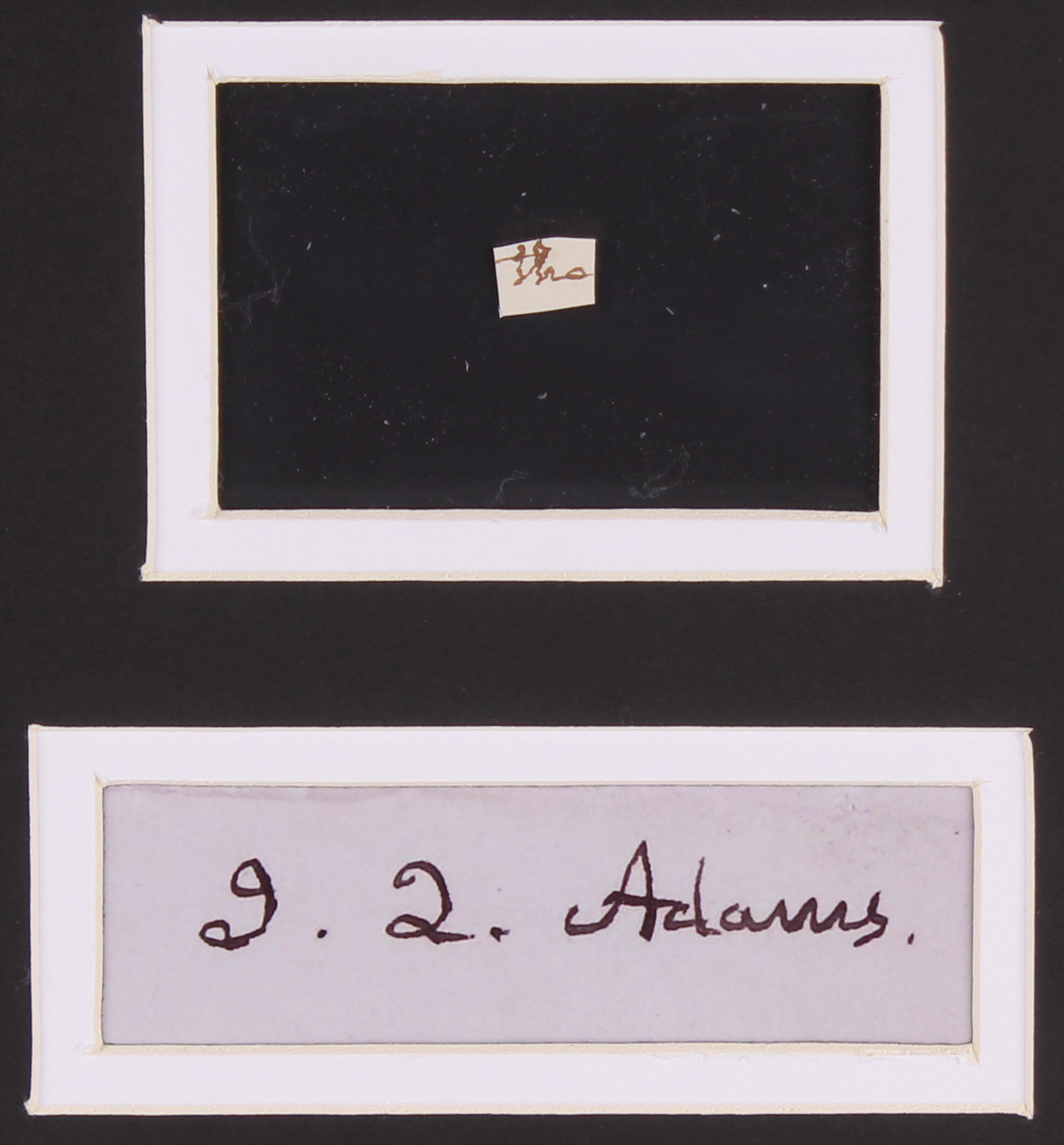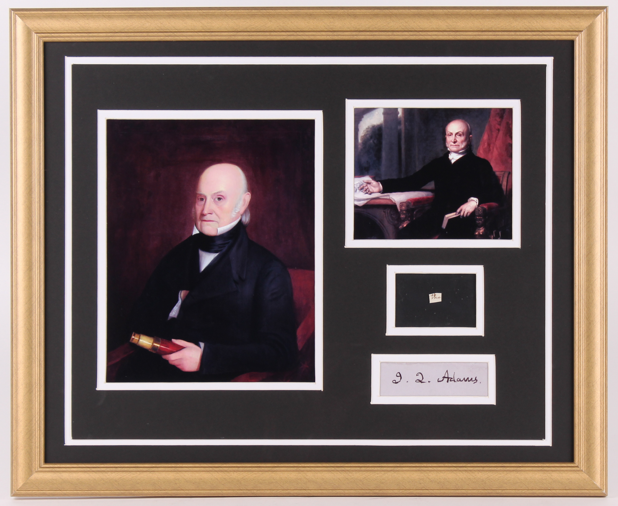 Custom framed display measures 18" x 22" in size and features a cut from a letter that has been penned by the hand of John Quincy Adams (D. 1848) in black dip pen. Please note that Adams' signature is a facsimile.