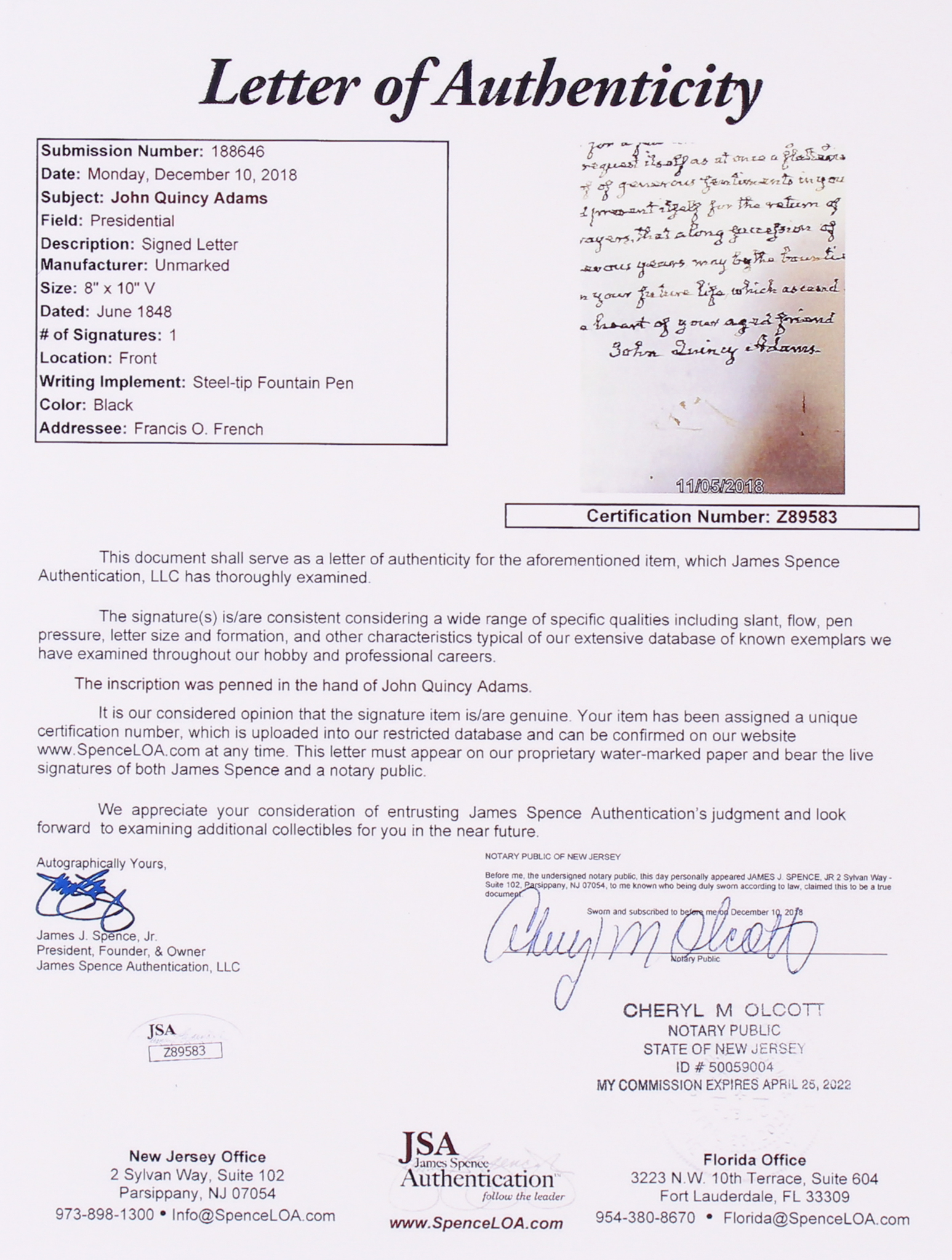 John Quincy Adams 18x22 Custom Framed Display with (1) Hand-Written Word From Letter (JSA LOA Copy)