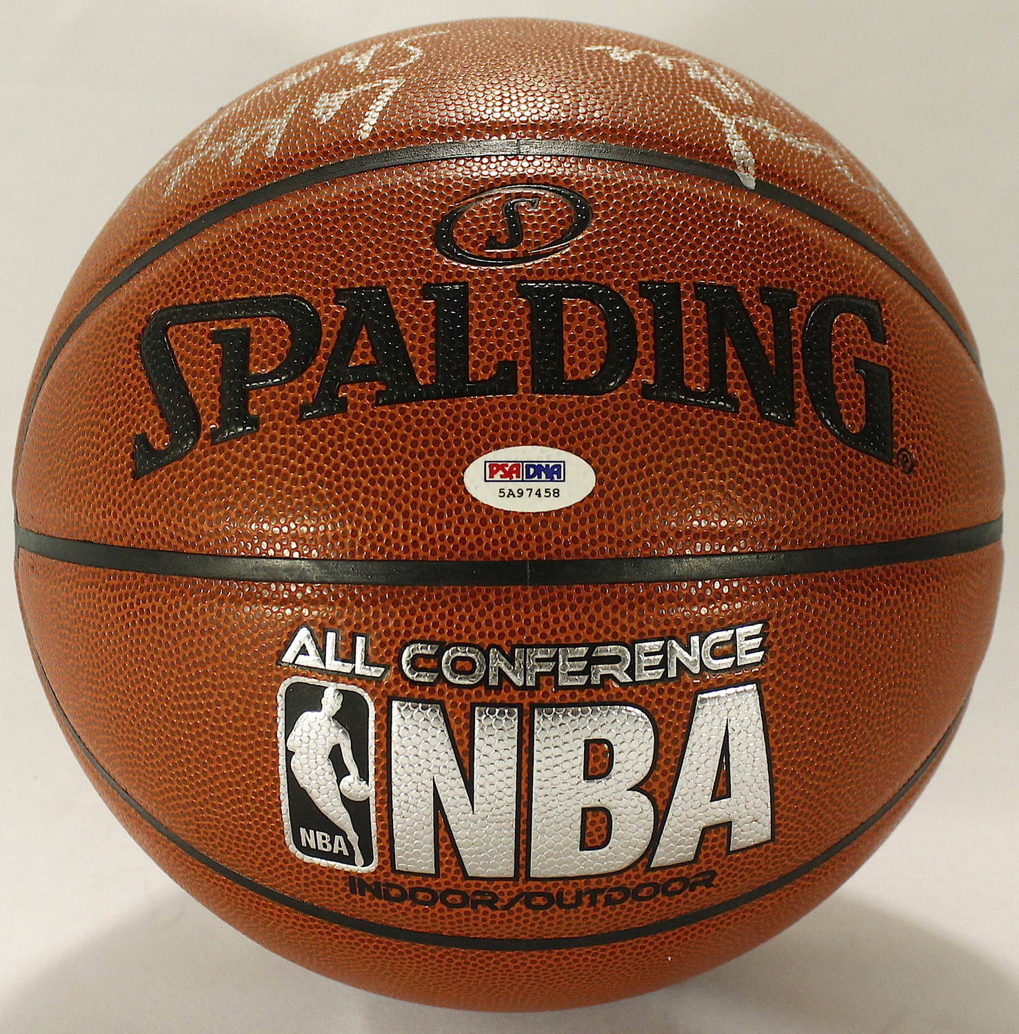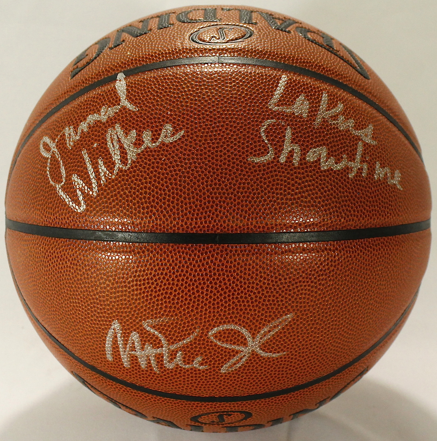 Spalding indoor/outdoor Basketball. Hand-signed and inscribed in silver paint pen by Magic Johnson (Lakers HOF) and Jamaal Wilkes (Lakers HOF). The autograph includes an official PSA/DNA hologram and matching COA for authenticity purposes. The signing of this item was witnessed by PSA.