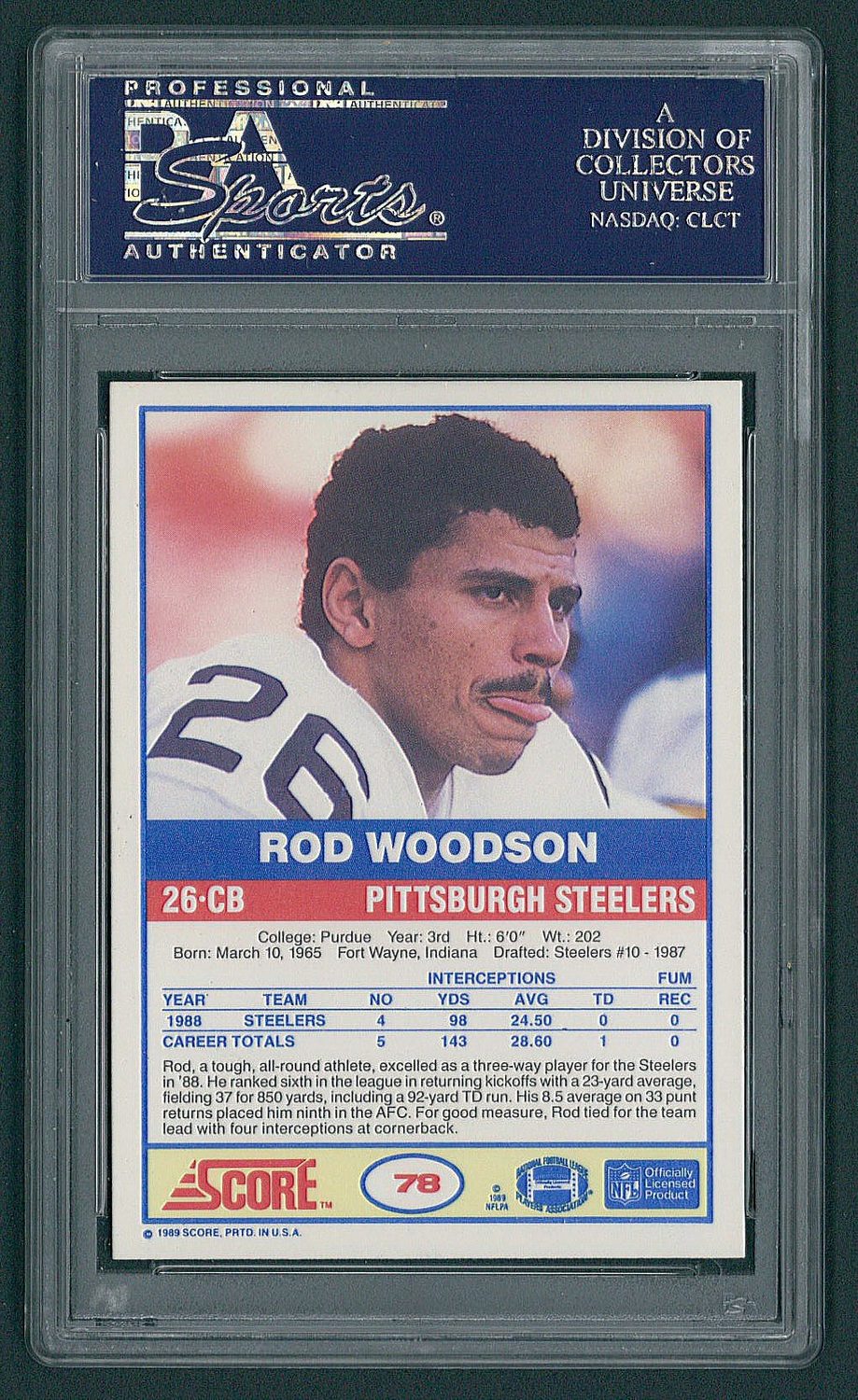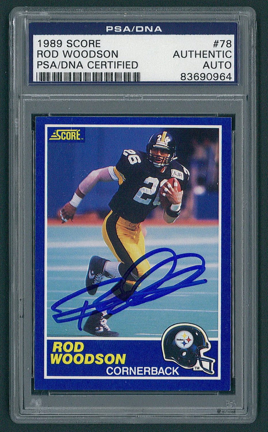 1989 Score #78 Rod Woodson Rookie Card. Hand-signed in blue felt-tip pen by Rod Woodson (Steelers HOF). Autograph has been certified and encapsulated by PSA/DNA for authenticity purposes.