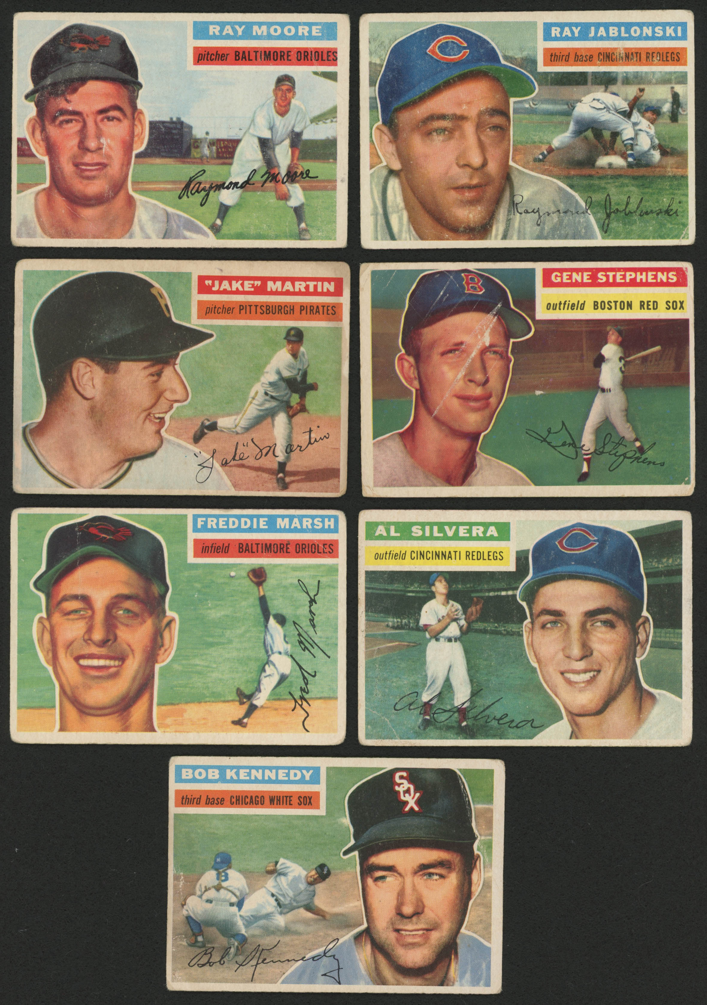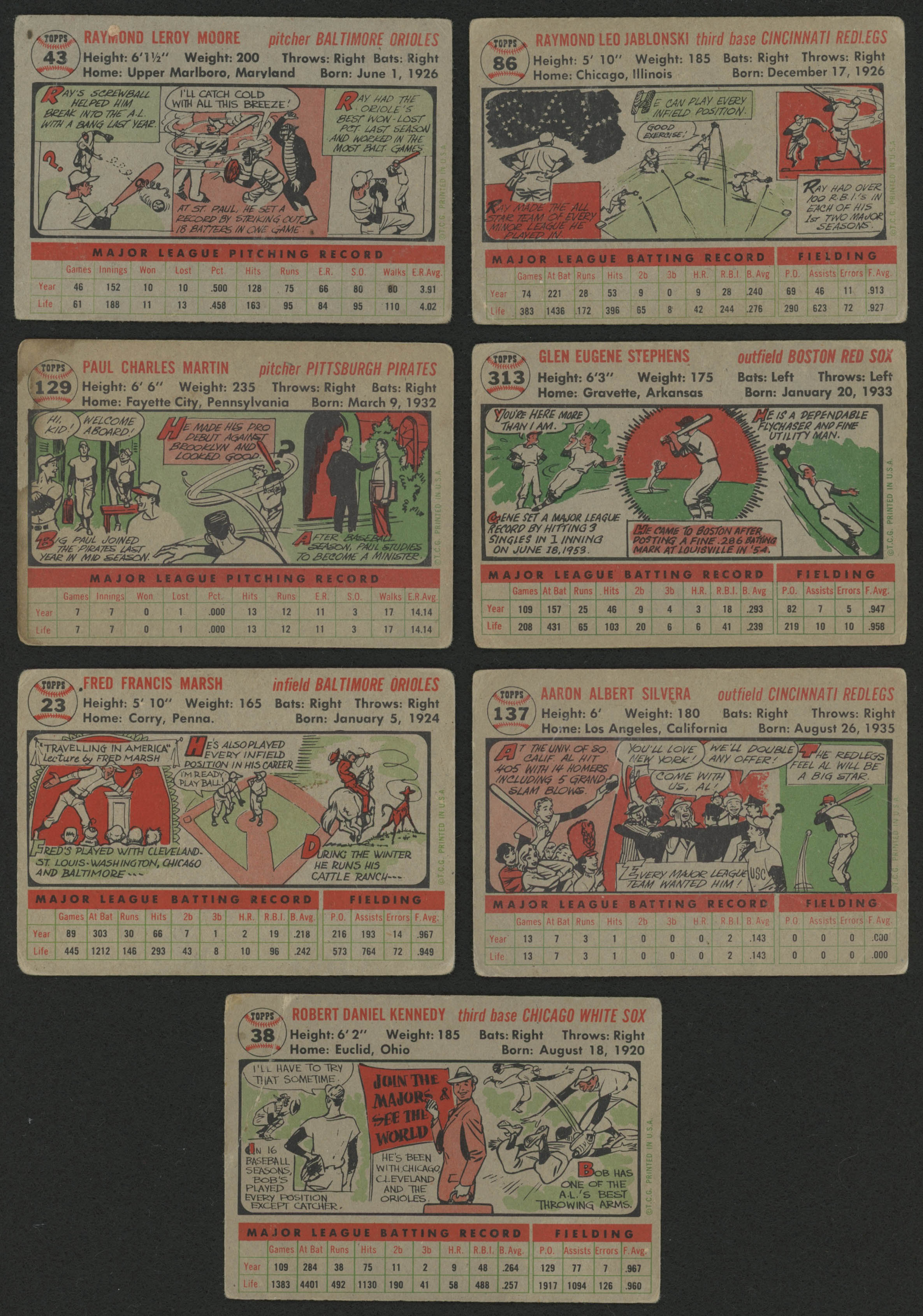Lot of (7) 1956 Topps Baseball Cards with #23 Freddie Marsh, #43 Ray Moore, #38 Bob Kennedy, #313 Gene Stephens