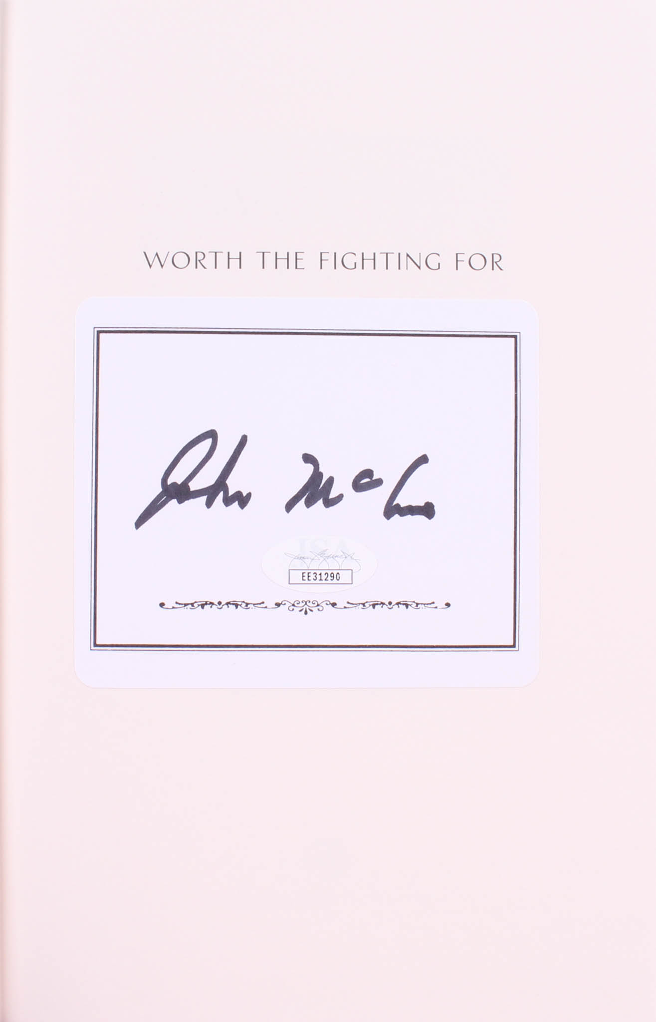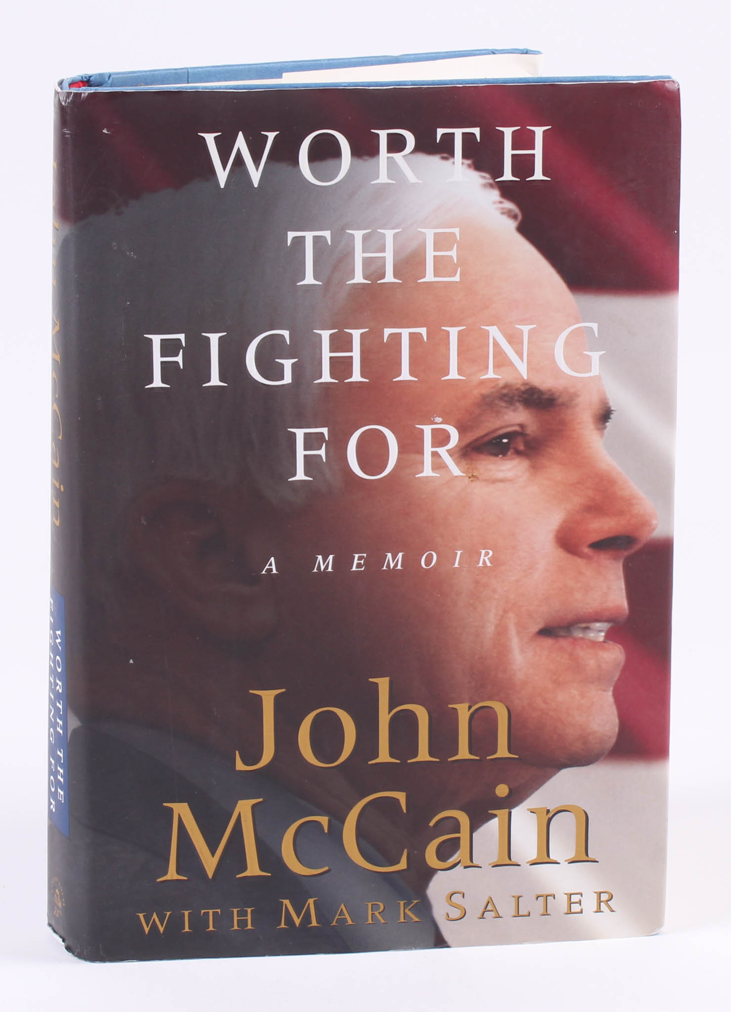 "Worth the Fighting For" Hardcover Book. Hand-signed in black felt tip pen on the inside cover by John McCain (D.2018).