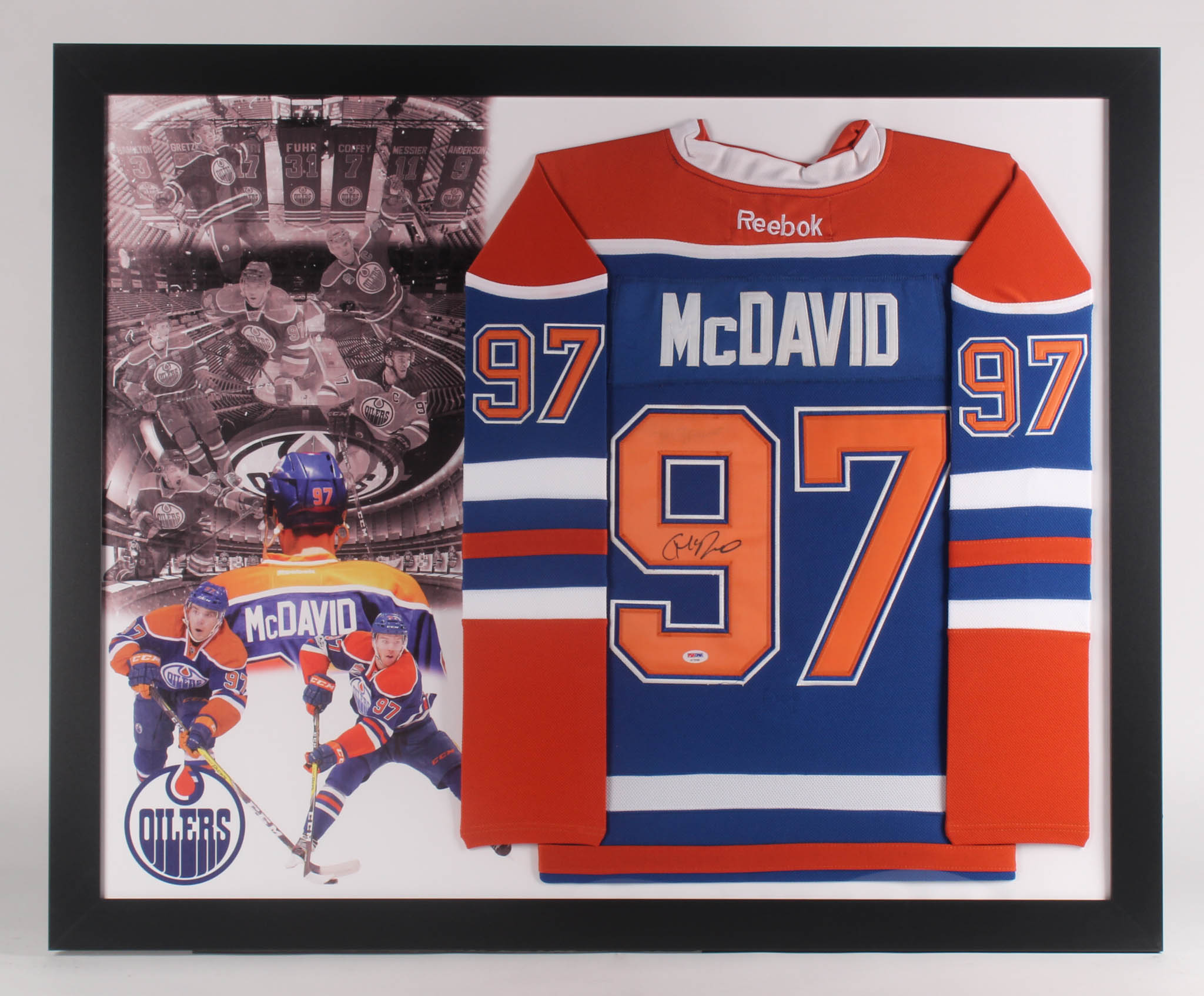Connor McDavid Signed Edmonton Oilers 35.5x43.5 Custom Framed Jersey Display (PSA Hologram)