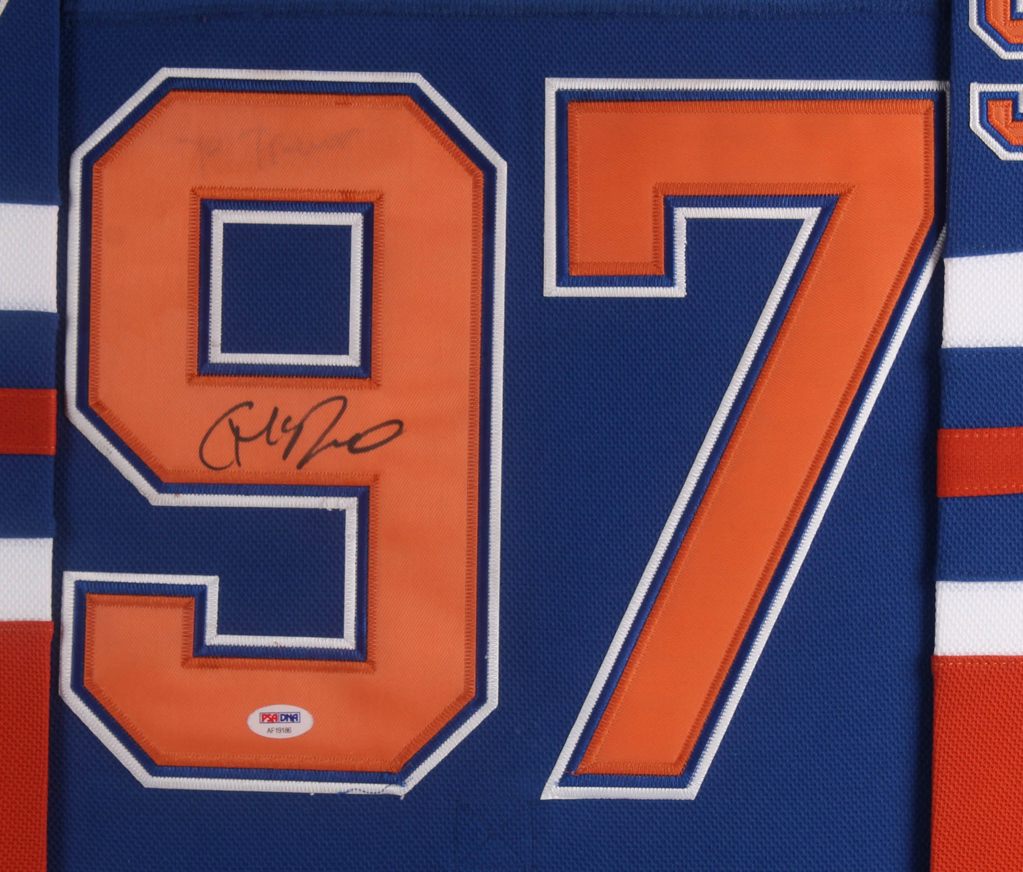 Custom framed display measures approximately 35.5" x 43.5" in size and features a jersey that has been hand-signed in black felt-tip pen by Connor McDavid. Please see photos for details regarding the condition of the frame.