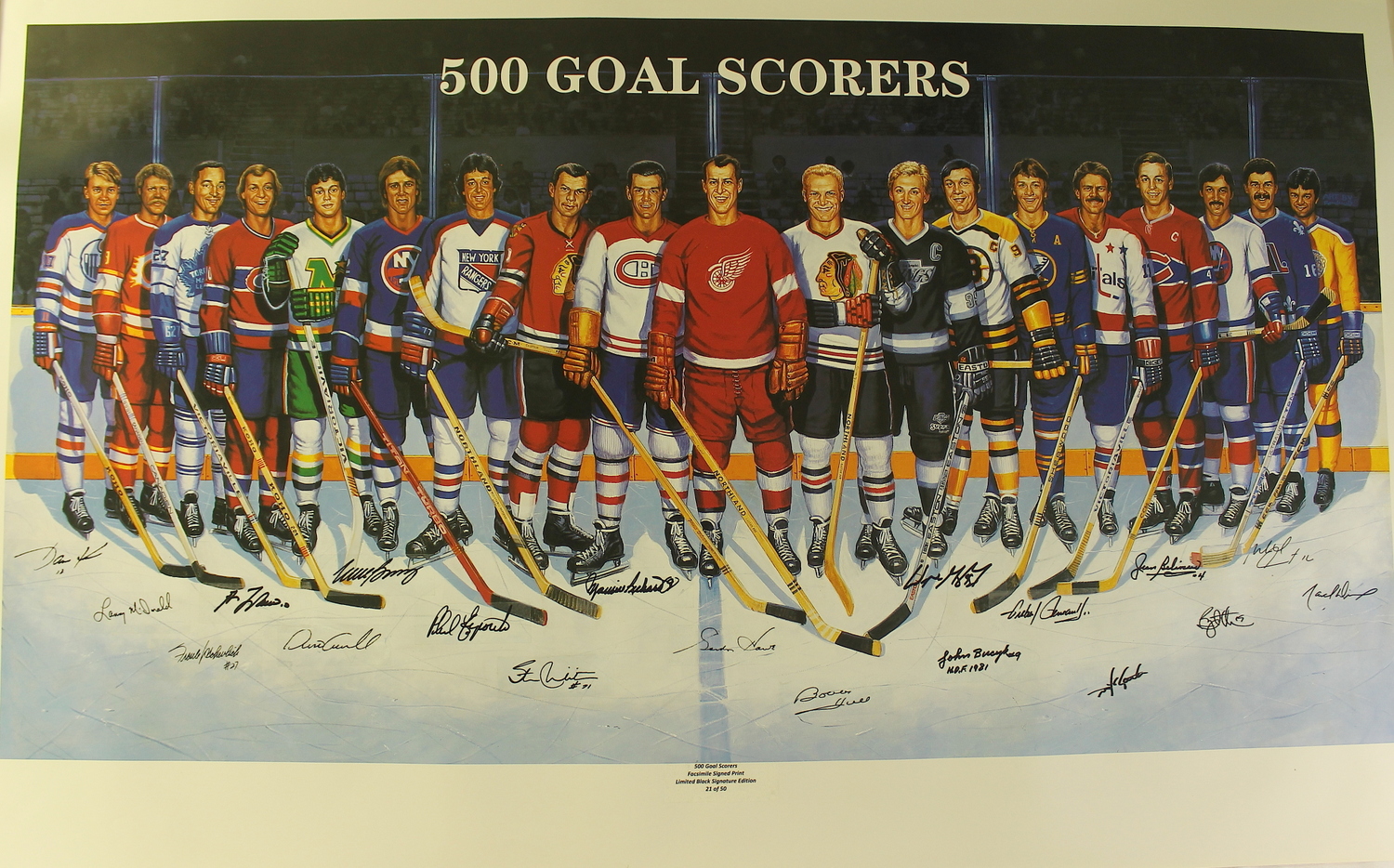 Lithograph measures 37" x 23" in size and features (19) NHL 500 Goal Scorers including Wayne Gretzky, Gordie Howe, Bobby Hull, Jean Beliveau, Maurice Richard, Frank Mahovlich, Lanny McDonald, Guy LaFleur, Dino Ciccarelli, Phil Esposito, Stan Mikita, Mike Bossy, John Bucyk, Gilbert Perreault, Jean Beliveau, Michel Goulet, Bryan Trottier, Marcel Dionne, and more. The piece features facsimile signatures from each of the (19) depicted 500 goal scorers. The signatures are facsimile, the lithograph is not hand-signed.